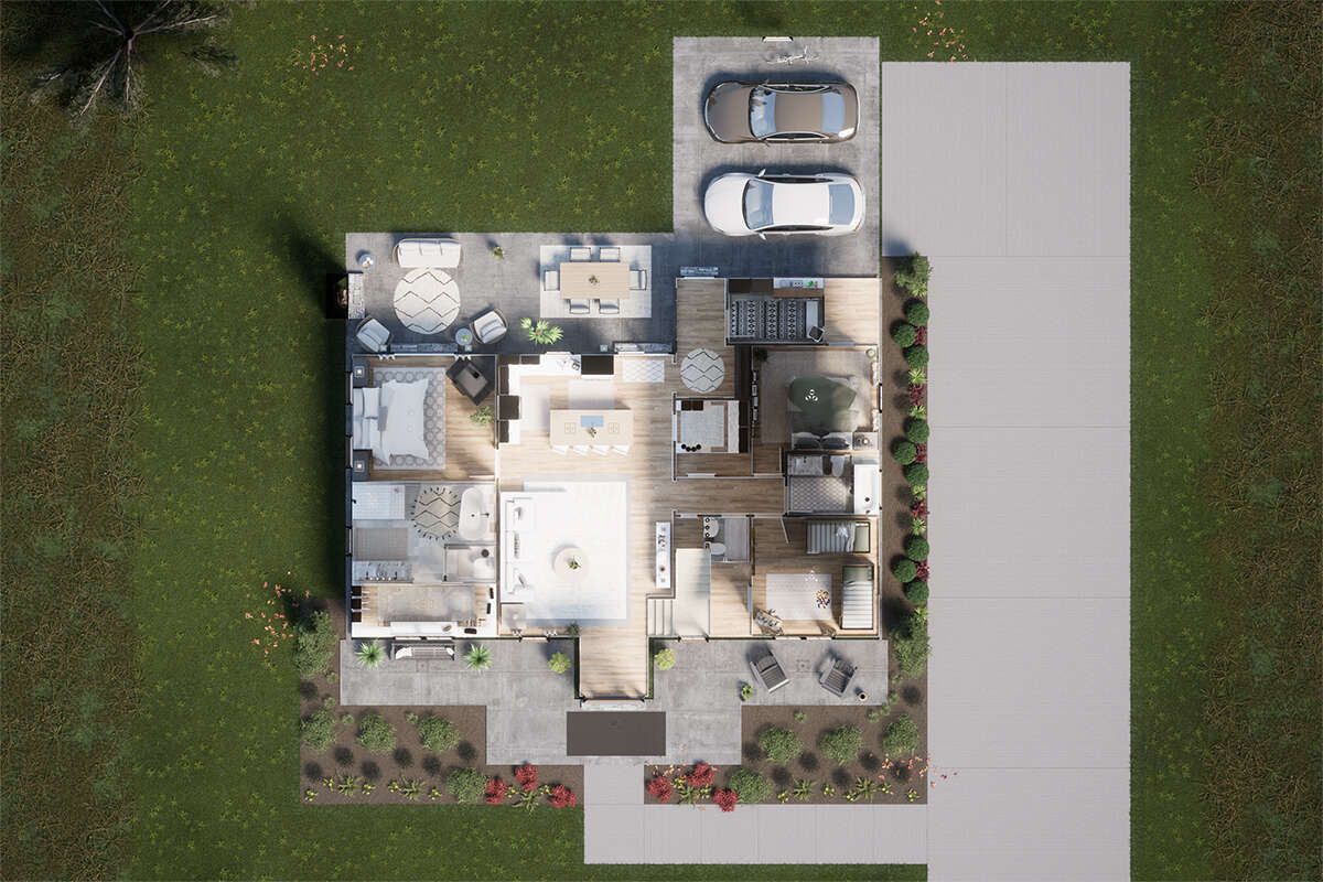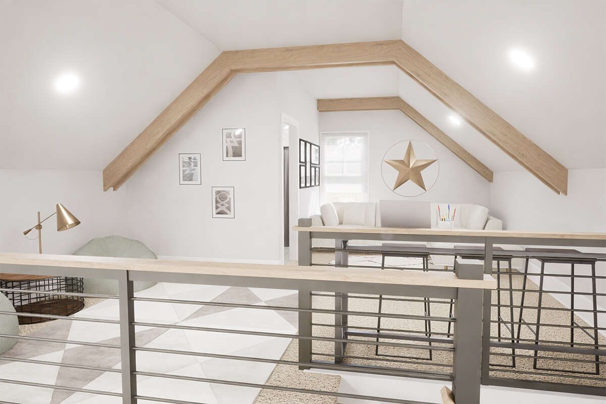 The master suite occupies one wing, and the two secondary bedrooms are positioned on the opposite side, separated from the main living zone. This keeps noise and traffic controlled. 6 A loft above adds flexibility—perfect as a media or play loft with its own bath. 7