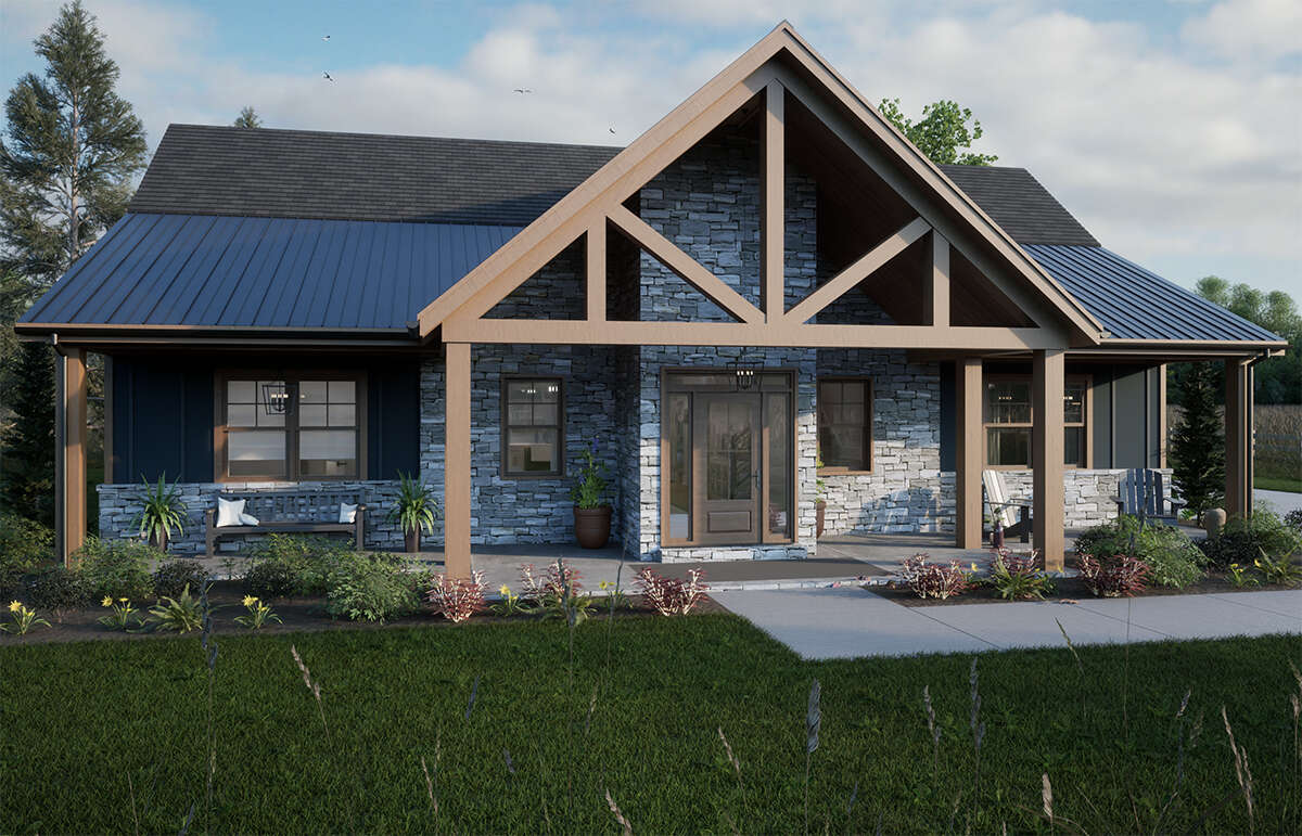 The façade features a wide covered front porch—supported by stone and timber posts—with a gable dormer that adds vertical interest. 1 Warm materials like stone accents at the base, craft timbers, and mixed siding contribute to its welcoming character. 2