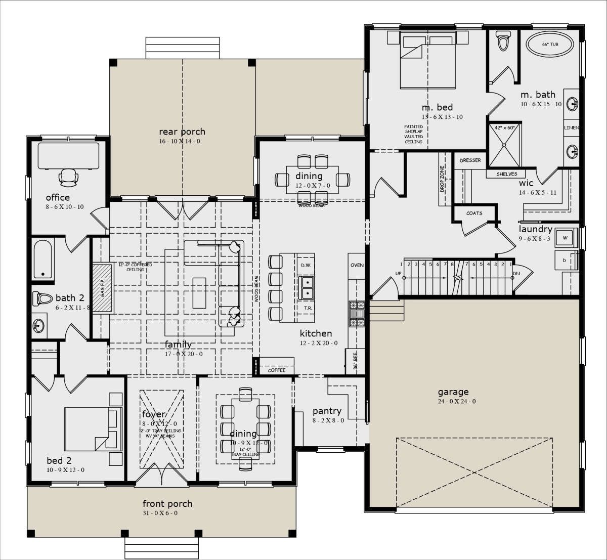 The vaulted great room defines the home’s heart. A fireplace or built-in feature creates a focal point, and large windows draw light deep into the space. 13 Open adjacency to dining and access to a rear porch give indoor-outdoor flow. 14