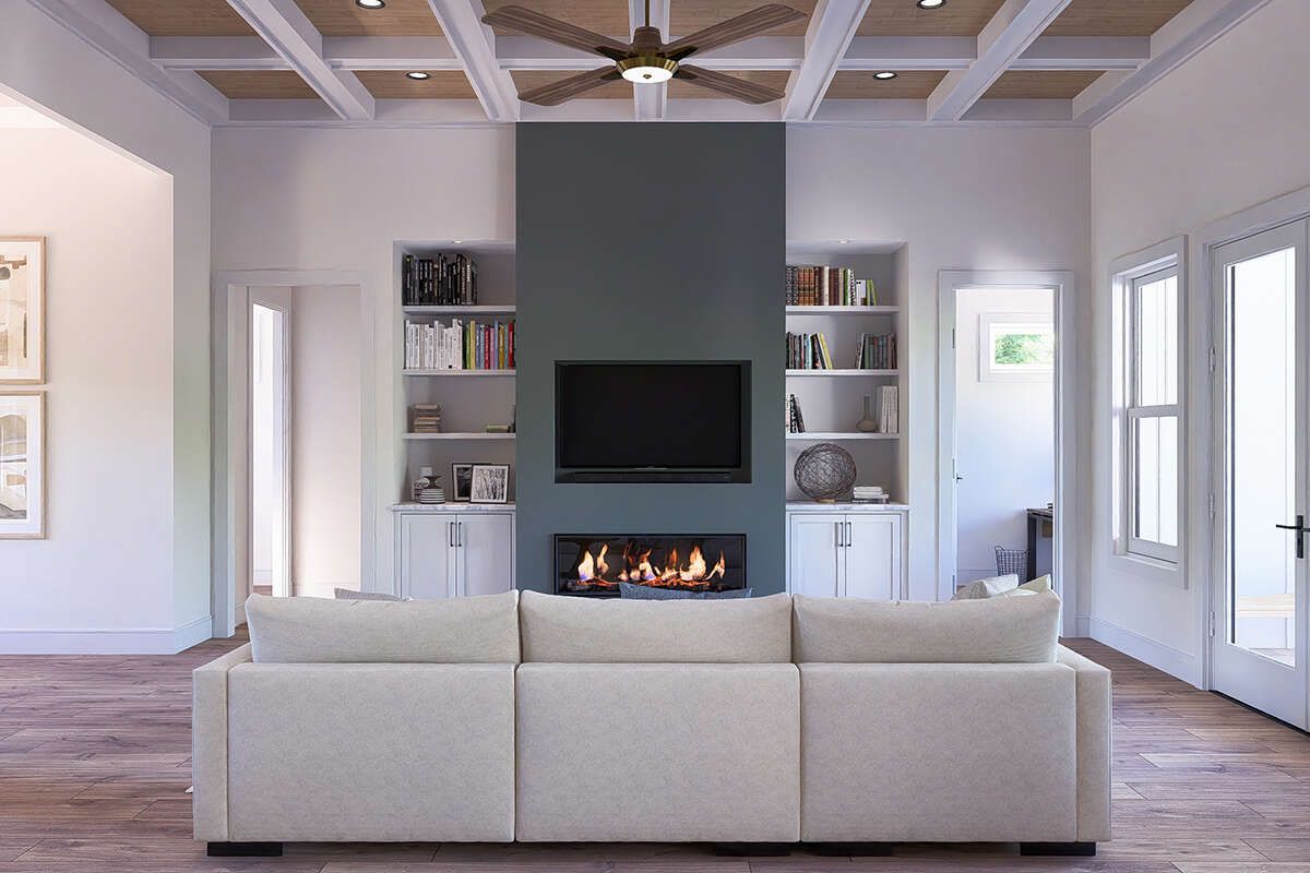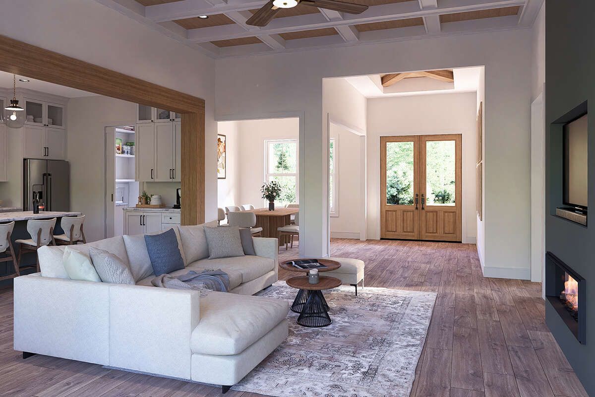 The vaulted great room defines the home’s heart. A fireplace or built-in feature creates a focal point, and large windows draw light deep into the space. 13 Open adjacency to dining and access to a rear porch give indoor-outdoor flow. 14