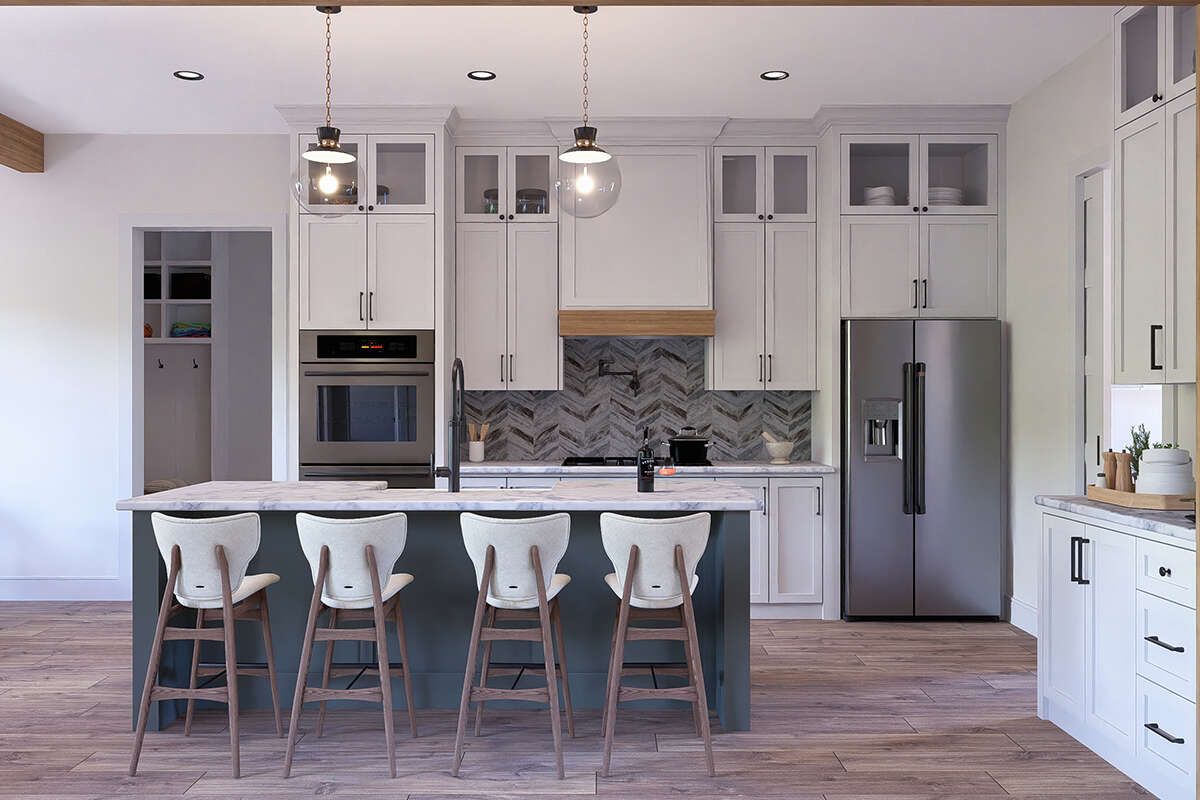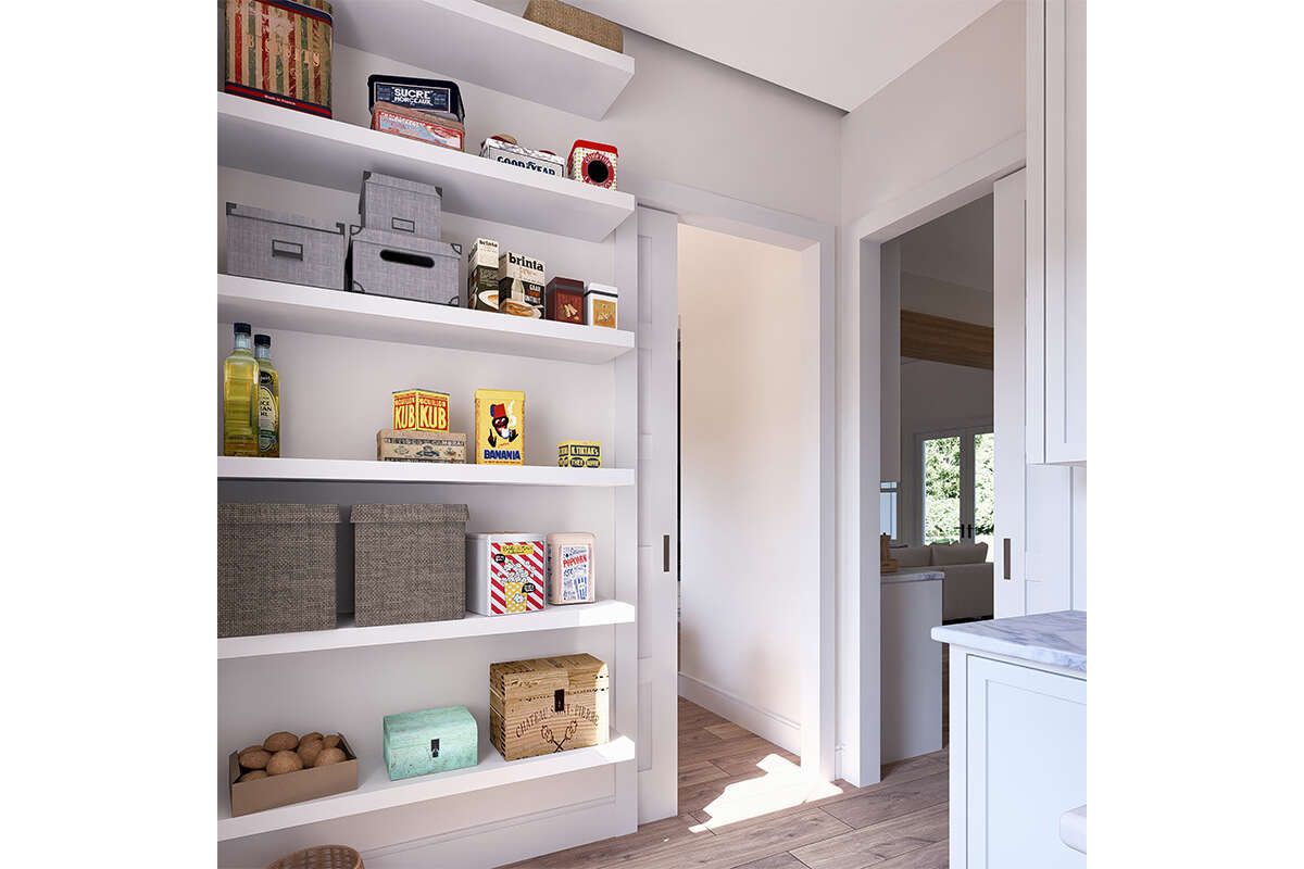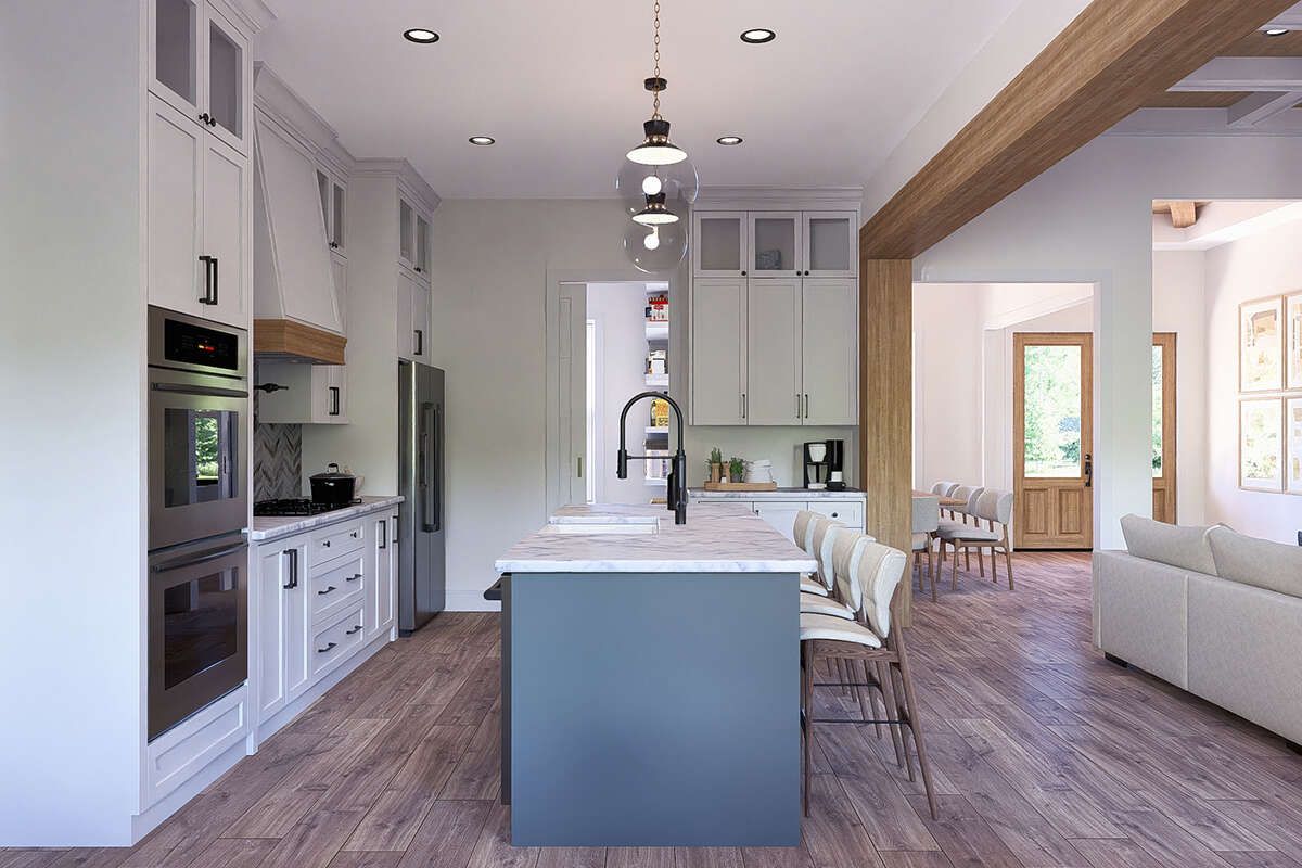 The kitchen is designed for balance and function. An island provides prep space and casual seating. 16 A walk-in pantry offers generous storage without dominating the core. 17 Because the kitchen opens into living and dining zones, the cook remains part of the gathering.