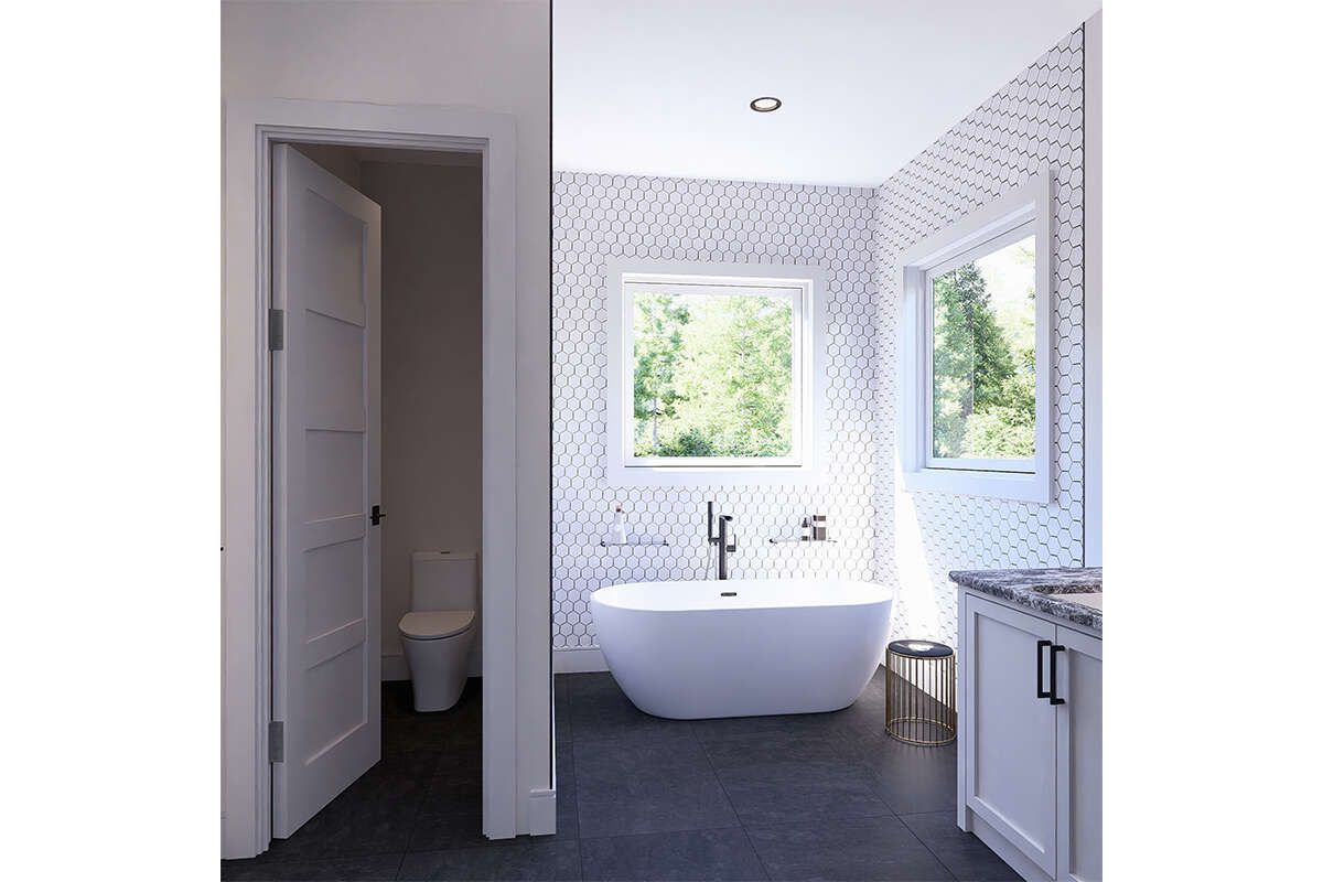 Supporting elements like timber accents, moderate overhangs, and simple trim help the design feel both refined and grounded. The one-and-a-half story nature gives opportunity for architectural interest in the upper volume. 4