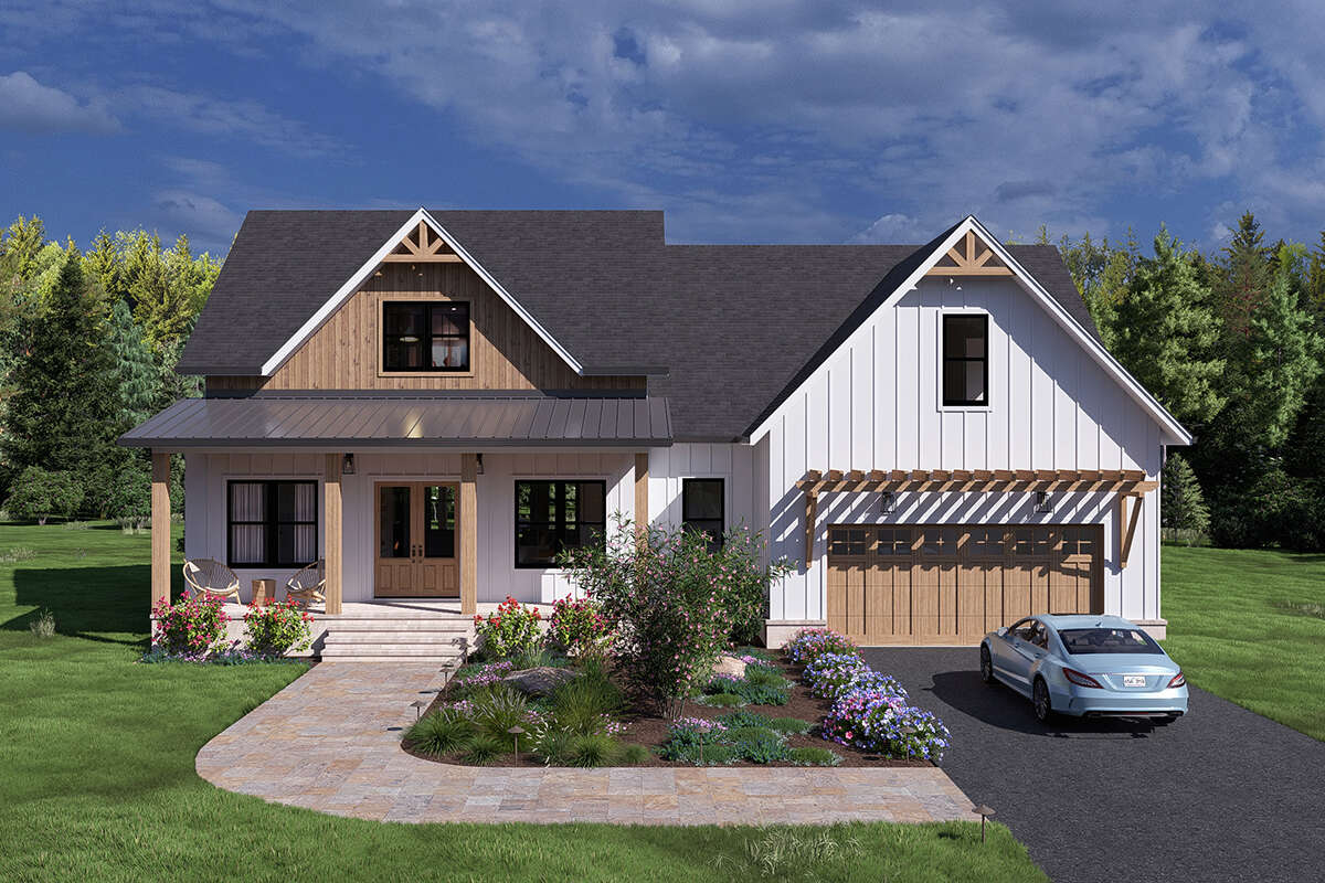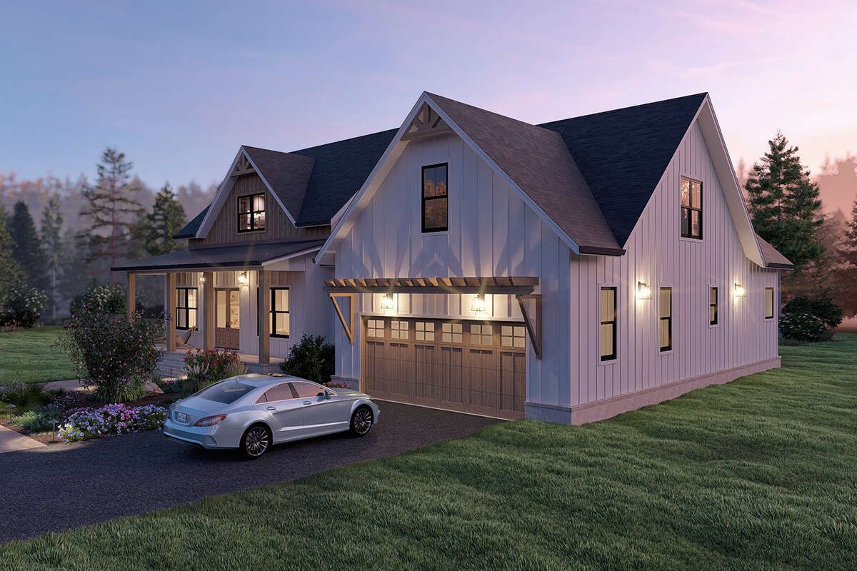 The façade is stylish and balanced: board-and-batten siding, a strong roof pitch (10:12), and crisp windows combine for a modern farmhouse aesthetic. 1 The home spans approximately **64′-2″ in width by 59′ in depth**. 2 The garage is side-entry and covers about **615 sq. ft.** of unheated space. 3