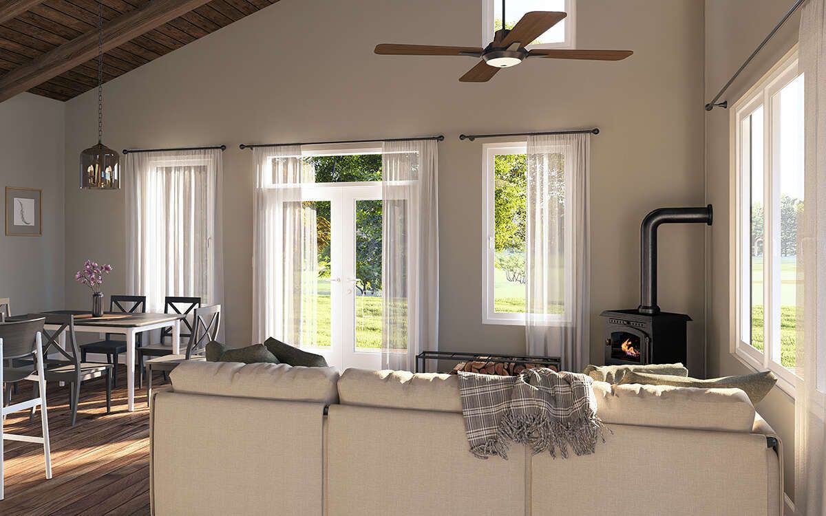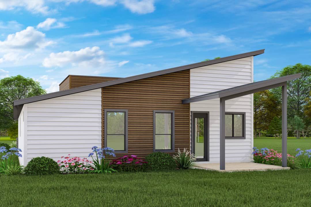 The façade reads modern yet approachable: simple roof pitches, wide eaves, and expanses of glazing. 1 A front porch of 72 sq. ft. welcomes guests, and a covered rear patio of 118 sq. ft. provides sheltered outdoor living. 2 The structure is framed with 2×4 exterior walls per standard, though modifications can adapt it. 3