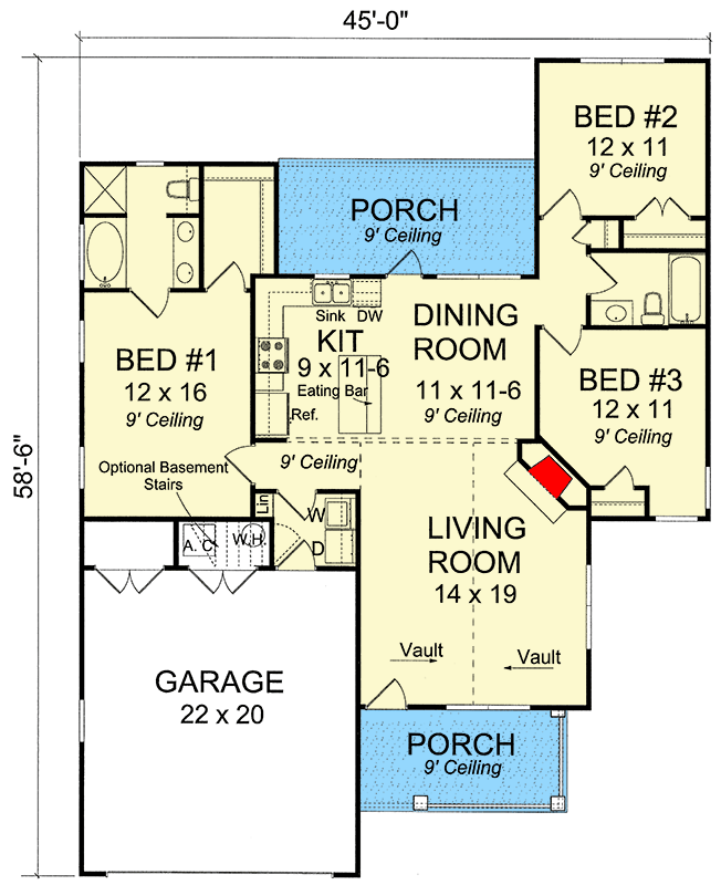 The main floor ceiling height is 9′, which is comfortable and economical. 15 The vaulted living zone introduces volume without requiring a full second story. Exterior walls are normally 2×4, though 2×6 is optional for increased insulation. 16