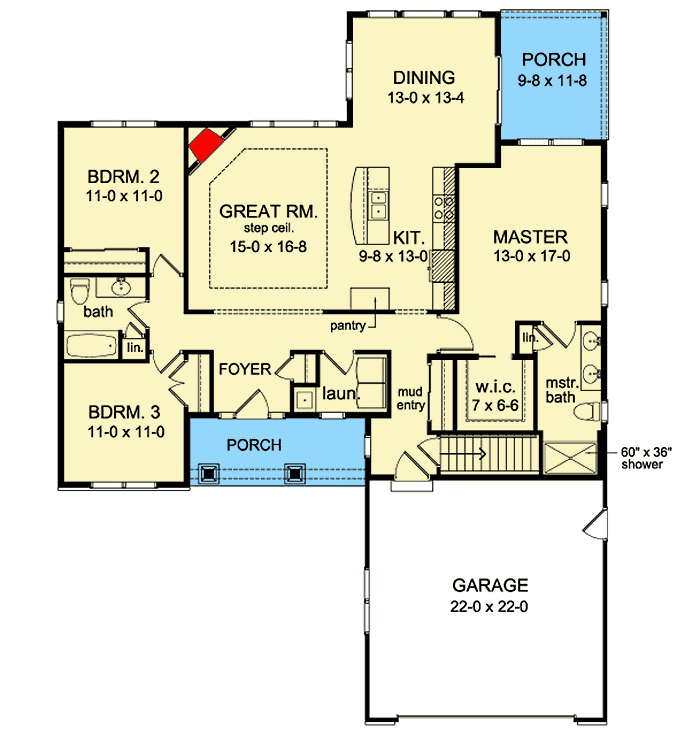 As a one-level plan, it avoids the cost and complexity of stairs or multiple floors, making structure, HVAC ducting, and accessibility simpler. Exterior walls may default to 2×4 framing, though upgrades to 2×6 are likely optional for improved insulation.