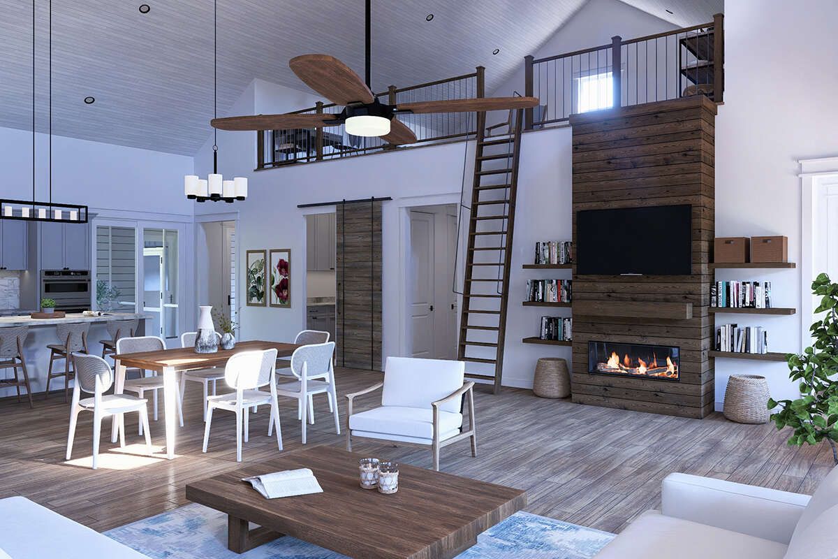 The living room is the emotional hub, probably featuring a fireplace or focal wall, large windows, and connectivity to outdoor living. It’s designed to accept flexible seating arrangements and to flow into adjacent dining and kitchen zones.