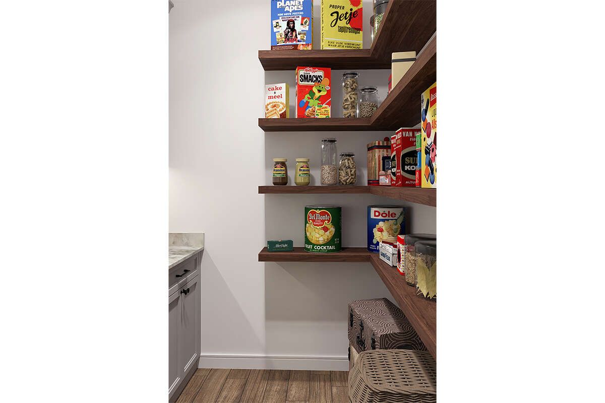 Storage is built into the plan via closets in every bedroom, a pantry in the kitchen, linen closets near bathrooms, and possibly built-ins in the living zones. Careful layout ensures storage without wasted space.