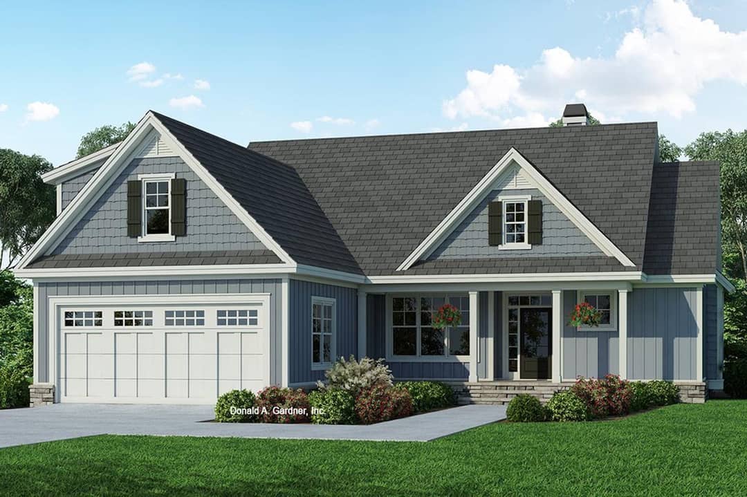 The façade combines board-and-batten siding with cedar shake accents, giving texture and visual interest. 1 The front porch is supported by eight tapered columns and spans 24′-2″ in width and 6′ deep, creating a welcoming entry zone. 2