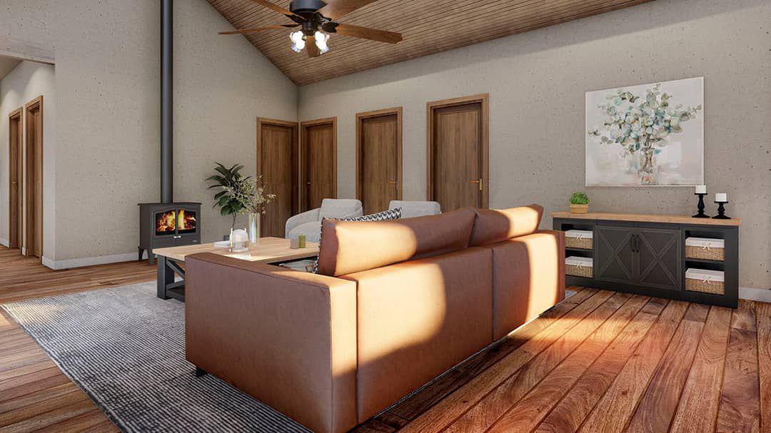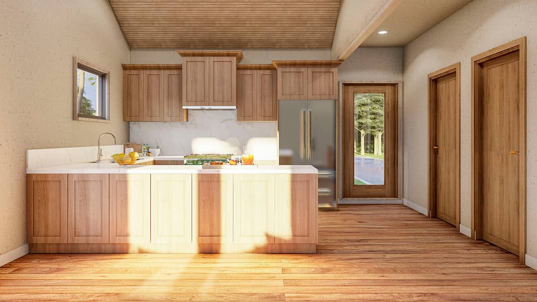 The plan features a **14′-6″ cathedral ceiling** that sweeps from the island kitchen through the vaulted great room, enhanced by a central skylight. 5 This vertical volume opens the core and makes the space feel generous despite the modest footprint.