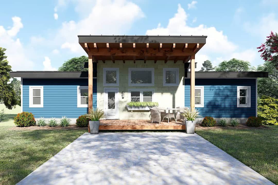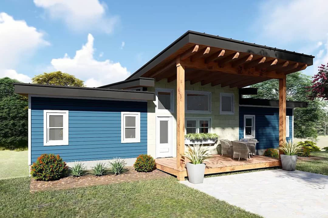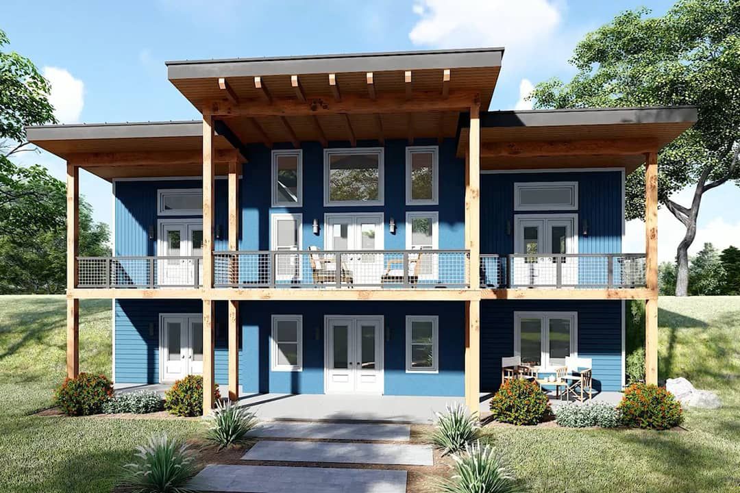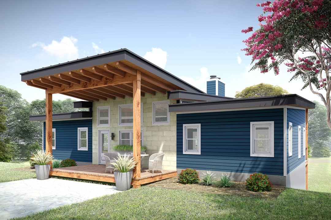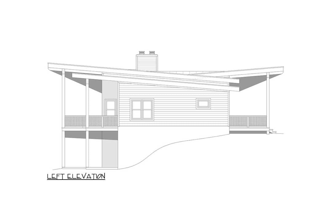This elegant mid-century modern design offers **1,541 sq ft** of heated living space featuring **2 bedrooms**, **2.5 baths**, and generous covered porches. The signature vaulted porch and stylish lines make it ideal for sloped or lakefront lots. 0