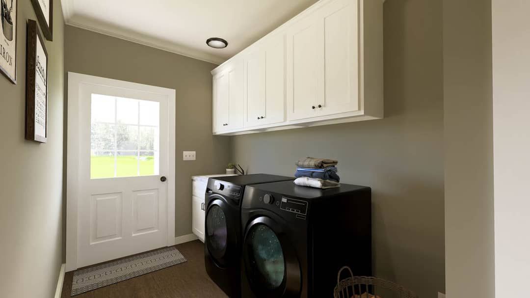 The bedrooms are clustered to one side, each with walk-in closets. One bathroom is private to the master (8′ × 9′), the other (9′ × 6′) serves family and guests off the common hall. 6 A large laundry / utility room is placed with convenient access from outside to handle daily chores gracefully. 7