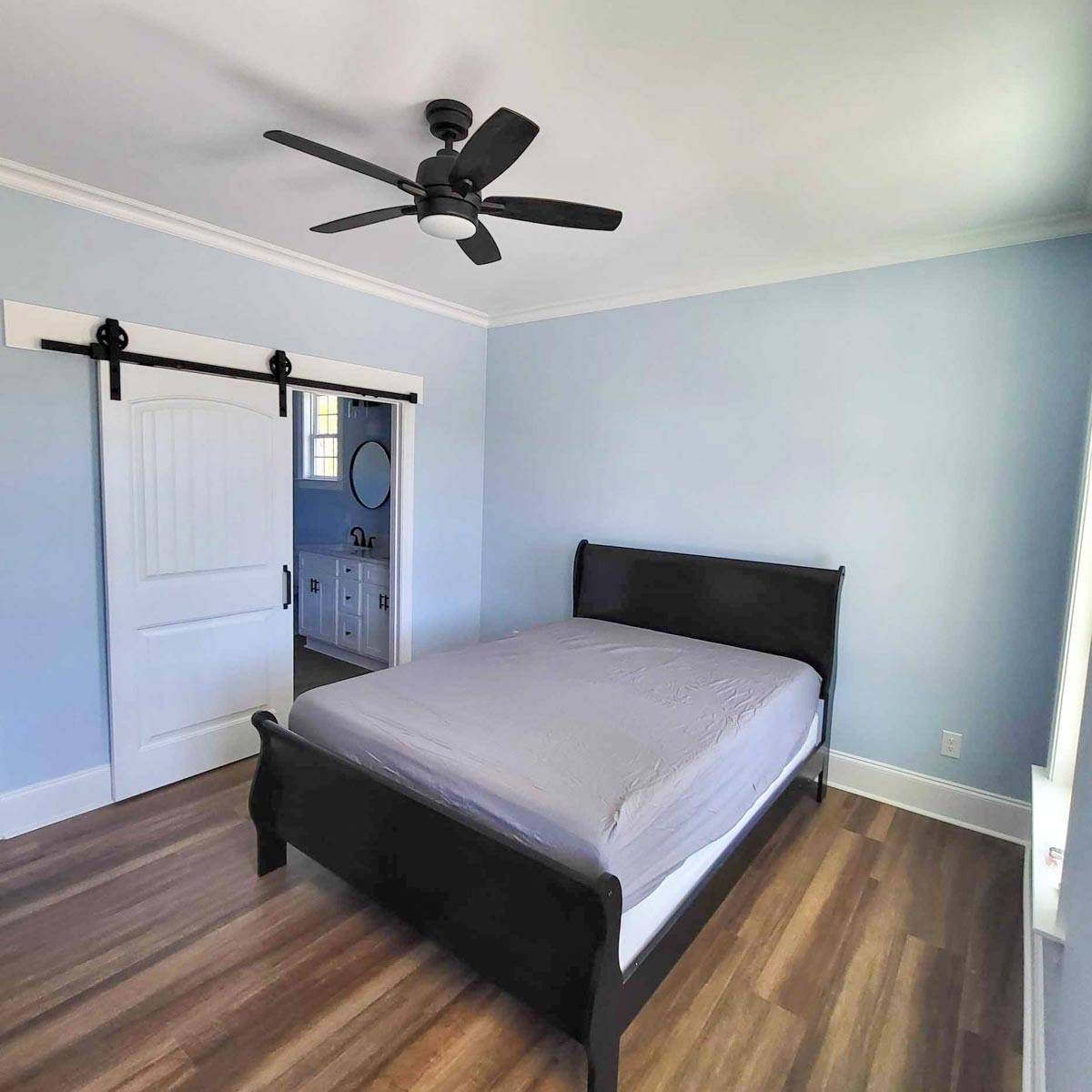 You enter directly into an open great room that flows naturally to kitchen and dining — the heart of the home. Large windows and French doors frame the rear covered porch, creating visual and functional connection to outdoors. 5