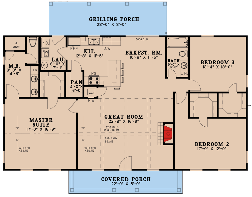 The first floor ceiling height is 8′. 21 Faux beams and vaulted elements in the great room enhance architectural character without overly complicating structure. 22