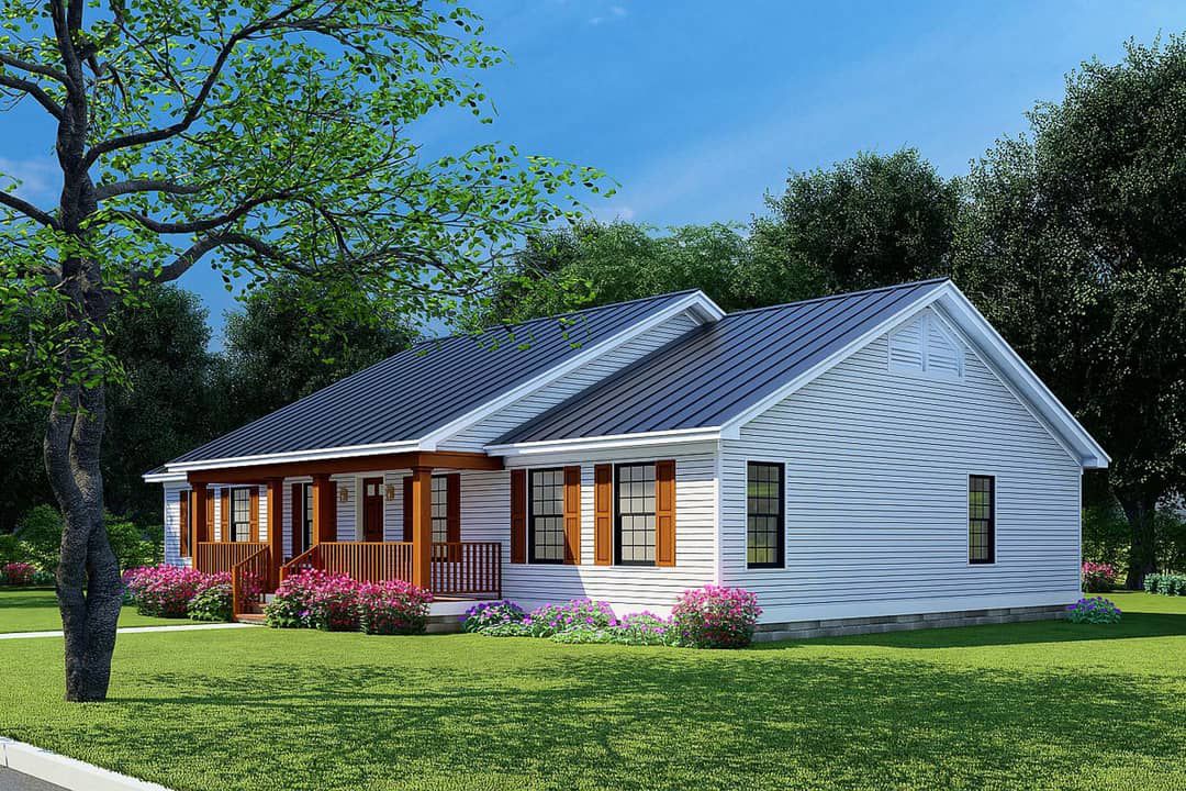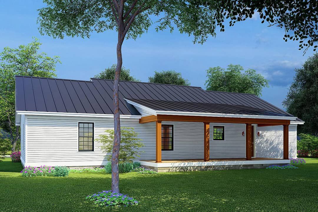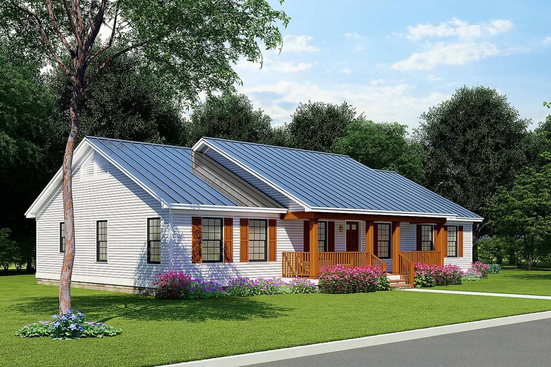 Wooden columns and railing frame the front porch, lending appeal. Metal roofing is shown over the porch for added character. 4