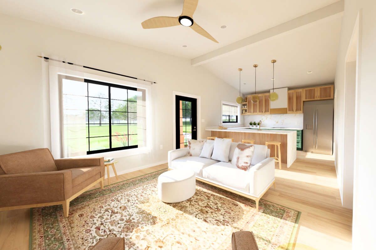 The living area is the heart of the home, open to the dining and kitchen, allowing a sense of spaciousness despite the modest square footage. Large windows help bring in daylight and connect to the porches. 8