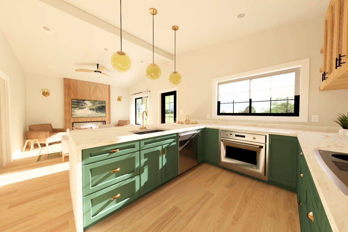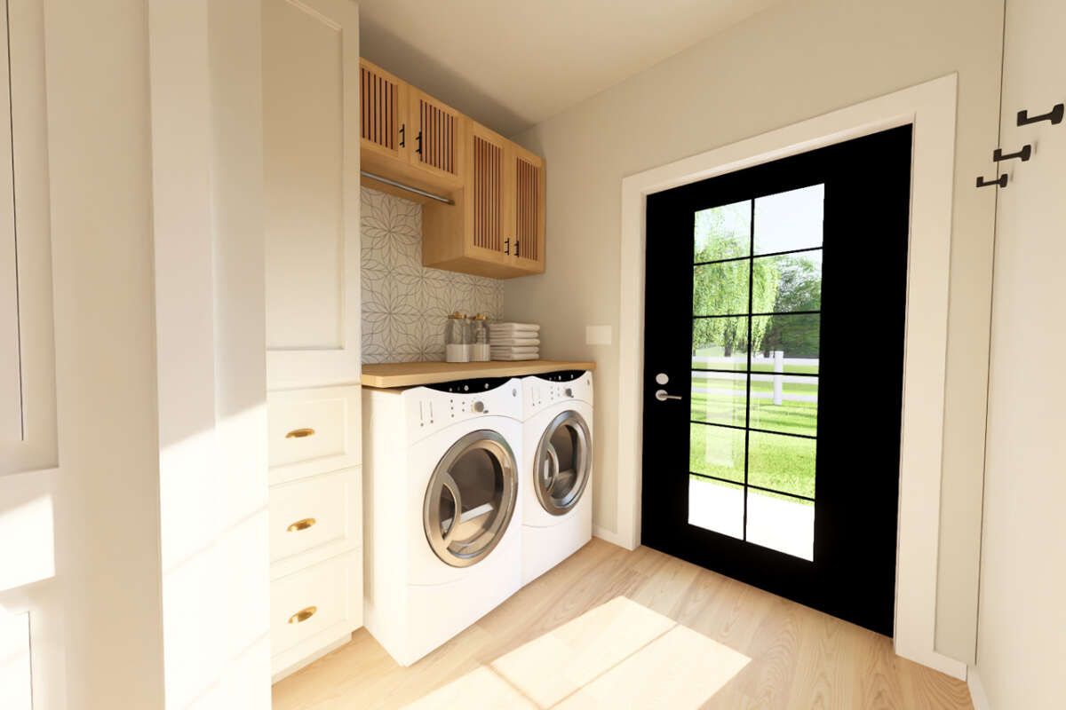 Dining is positioned adjacent to the kitchen and near the rear porch, so meals can easily flow outside during nice weather. This adjacency helps maximize utility in the compact footprint.