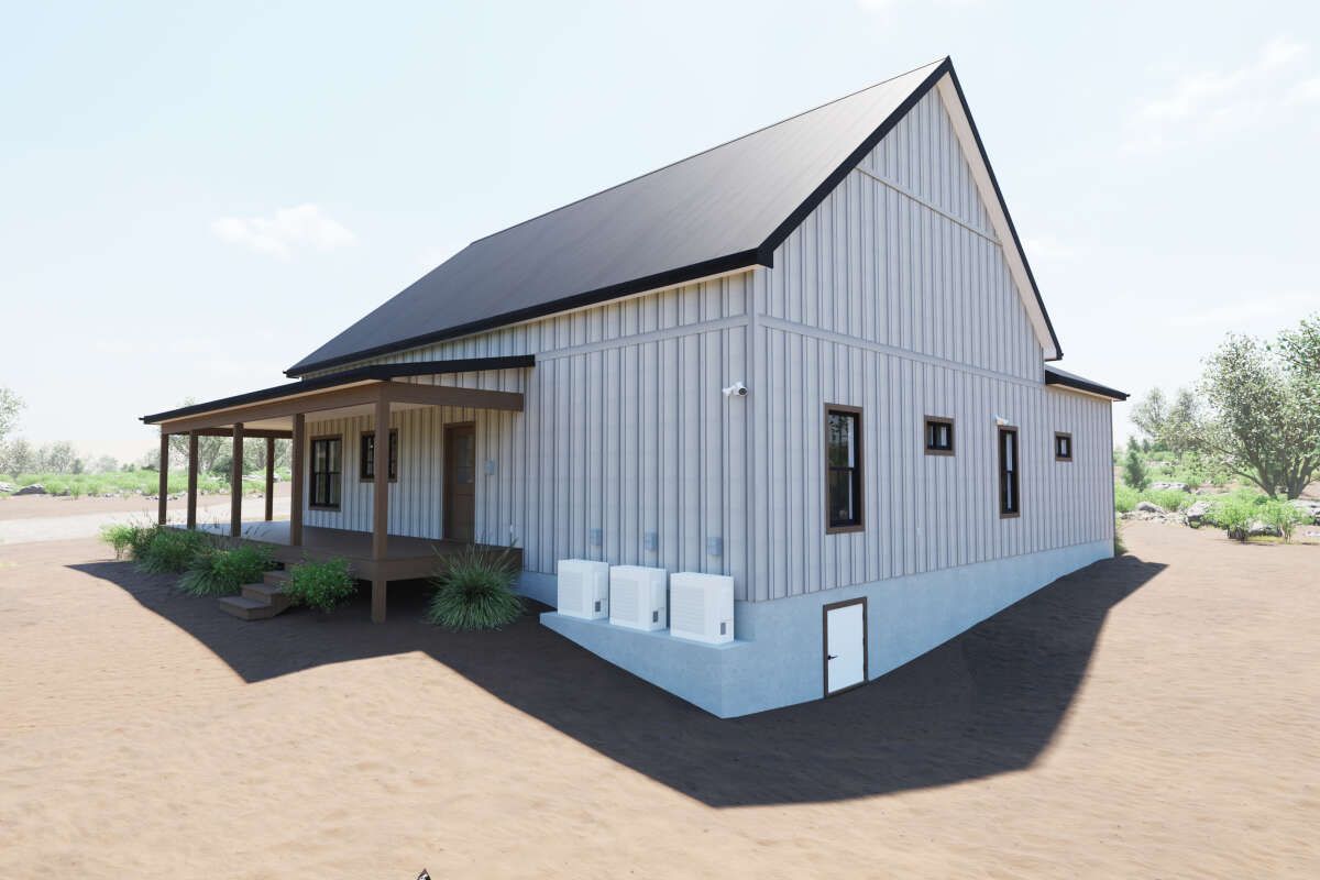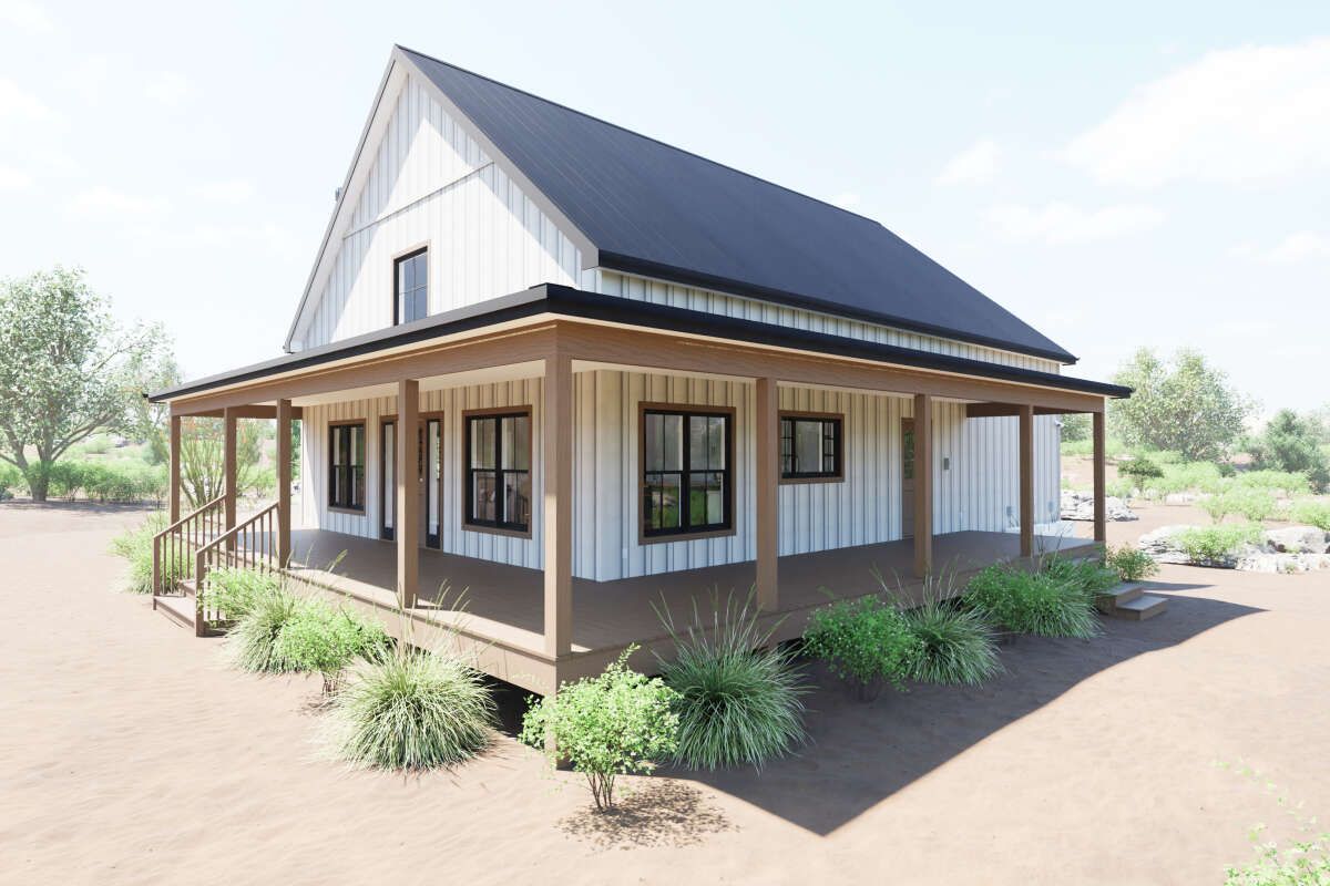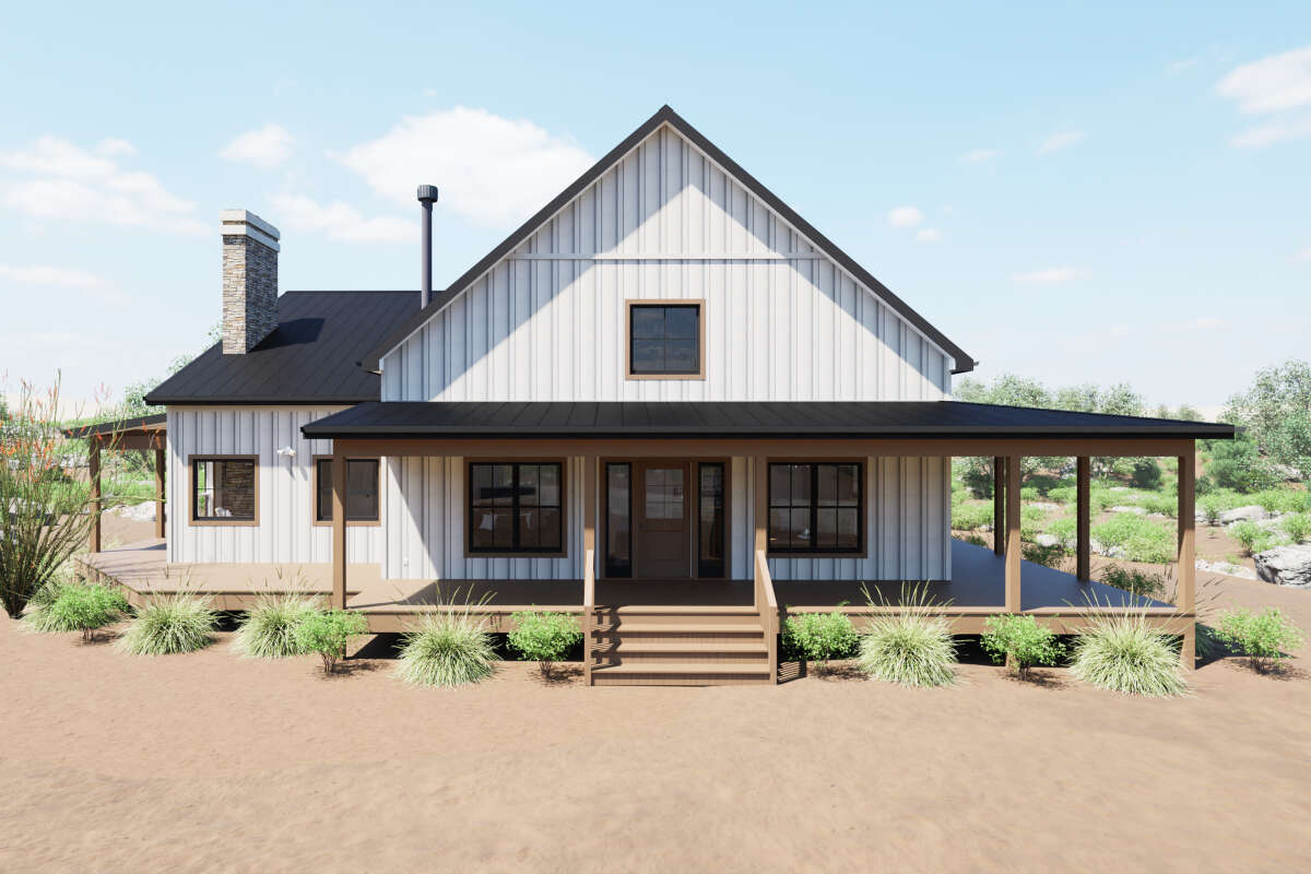 The exterior showcases a crisp modern farmhouse aesthetic with board-and-batten siding, clean lines, and a prominent covered porch presence. The generous porch and patio area (996 sq ft) helps to soften the interior/ exterior line. 1