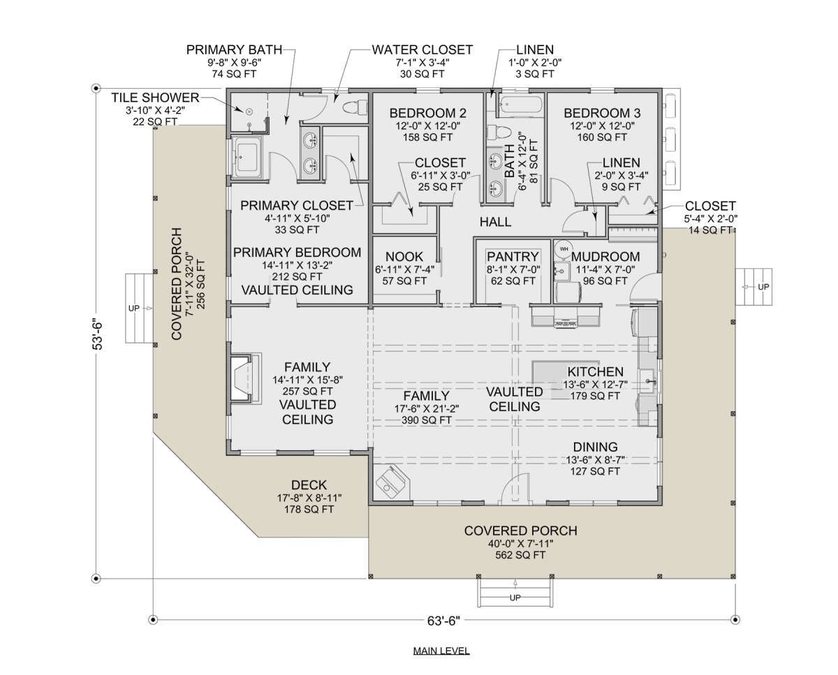 With **996 sq ft** dedicated to porches and patios, this design ensures outdoor life is integral. Covered porches wrap portions of the home, allowing sheltered transitions outdoors. 11