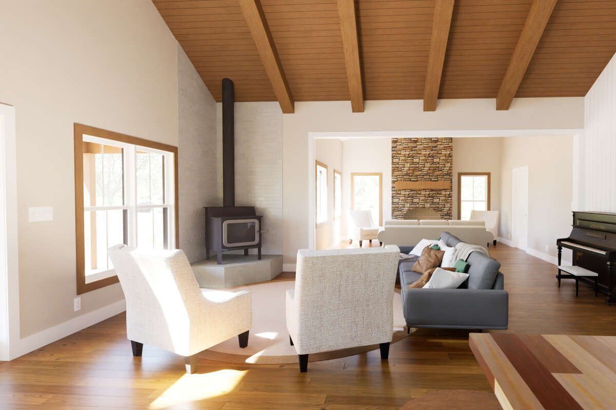 The great room is designed to be the heart of the home: high ceilings, ample natural light, and adjacencies to both the dining and outdoor spaces. The fireplace (if included) anchors the living zone. 9