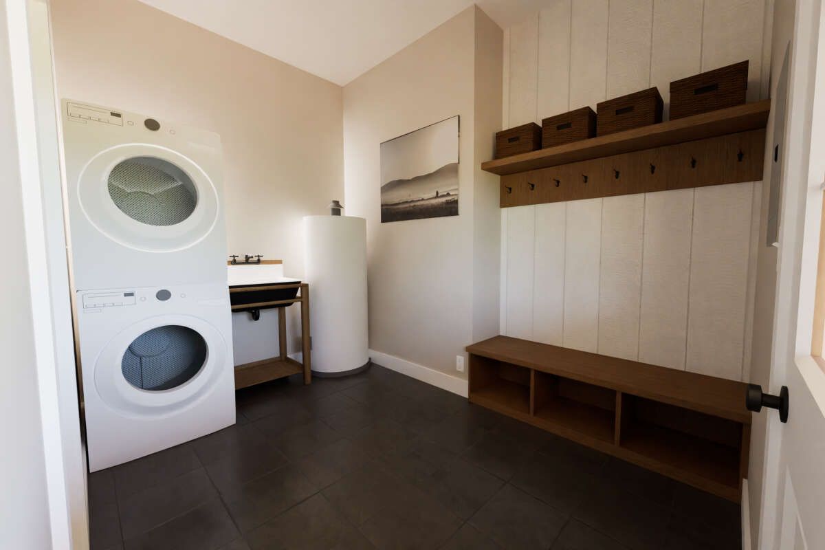 Plumbing for the kitchen and bathrooms is grouped nearby, mitigating long runs and reducing mechanical complexity. Storage is maximized through cabinetry and pantry space.