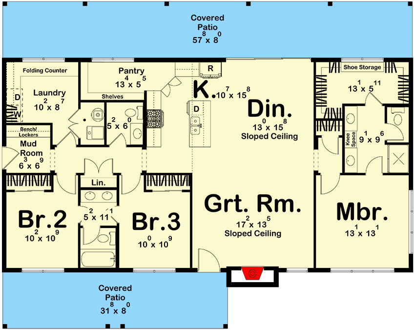 This base plan does **not** include a garage. However, storage is built into utility zones, closets, pantry, and potentially attic/loft space above the great room. Future garage or shop additions are feasible within the barndominium style.