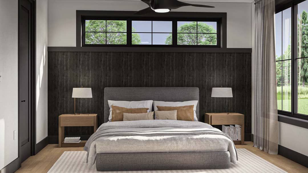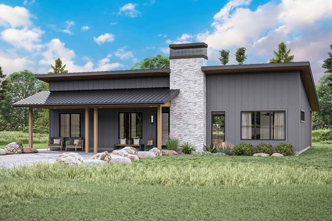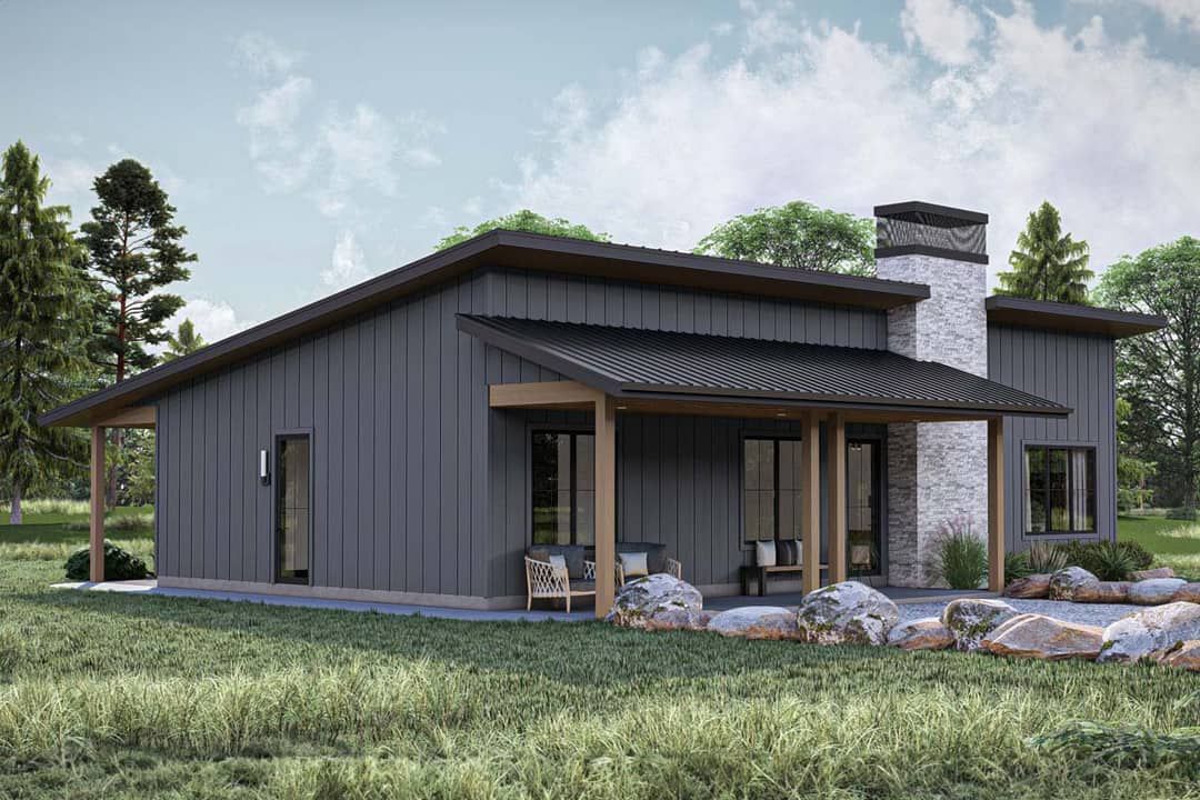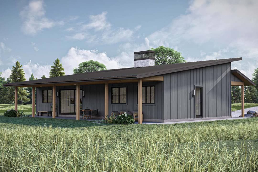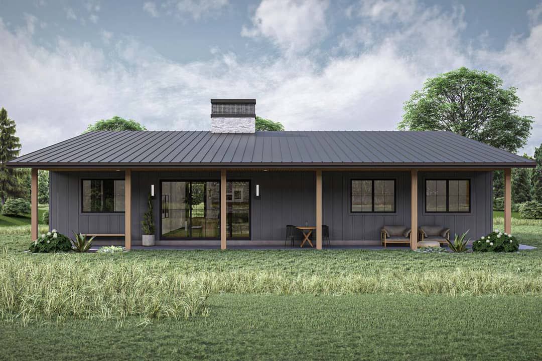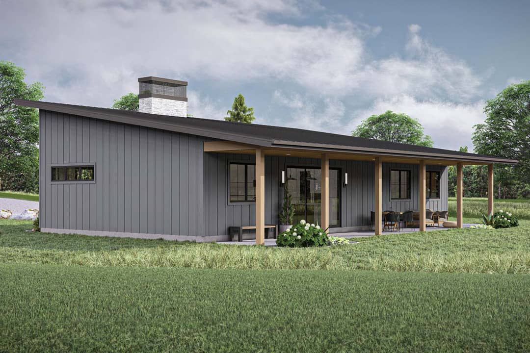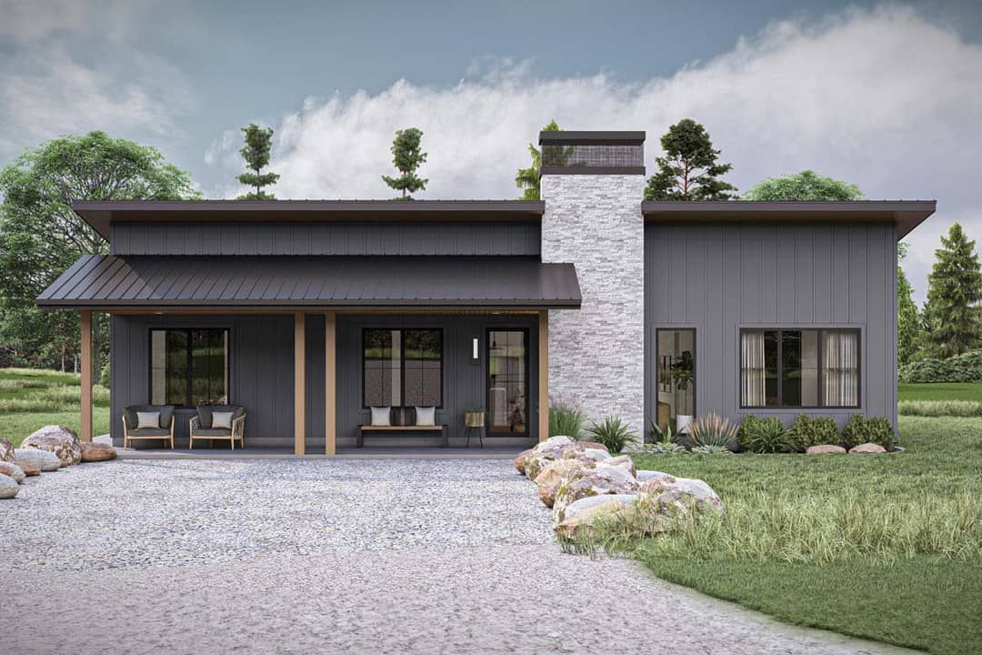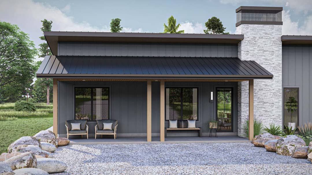 This plan masterfully fuses barn aesthetics with livable home comfort. The sloped ceiling gives sculptural drama, while the porch area anchors indoor life to outdoors. The split-bedroom layout offers both privacy and communal flow. It’s ideal for those who love rustic-industrial character, strong volumes, and flexible planning under one roof. For a home that feels bold yet cozy, this barndominium design is a standout choice.