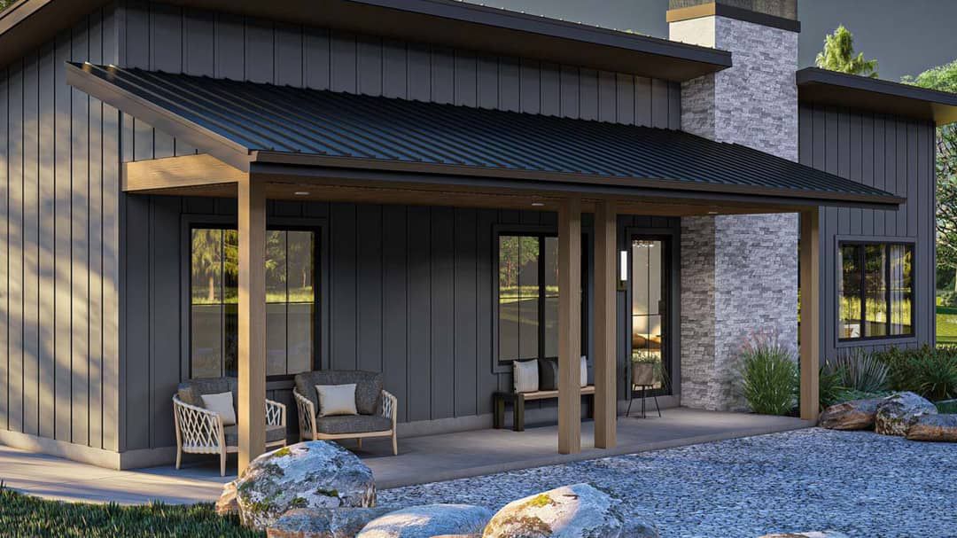 Exterior porch areas may be enclosed or partially modified to increase covered space. The barndominium framing style often supports such flexibility without radical redesign.