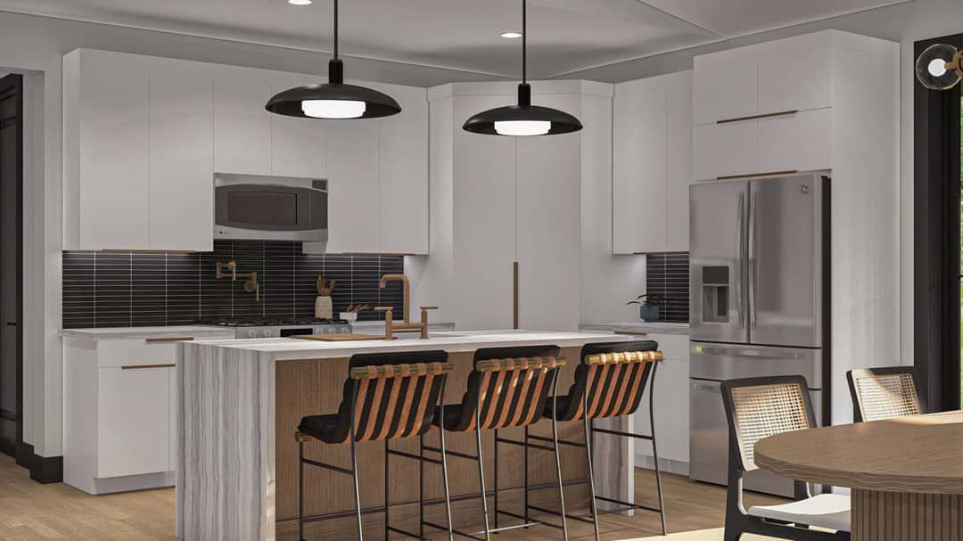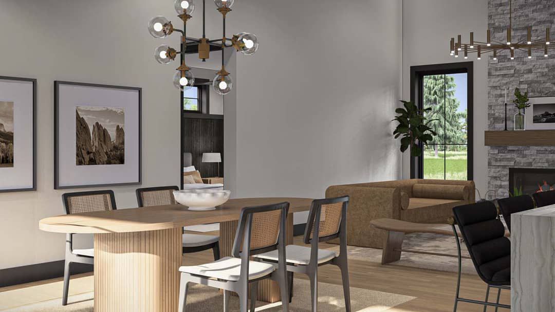 Dining is adjacent, allowing for fluid interaction between food prep, dining, and lounging. The layout supports both everyday flow and entertaining.