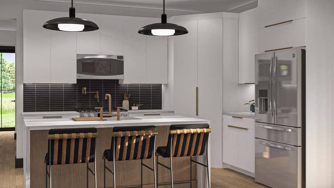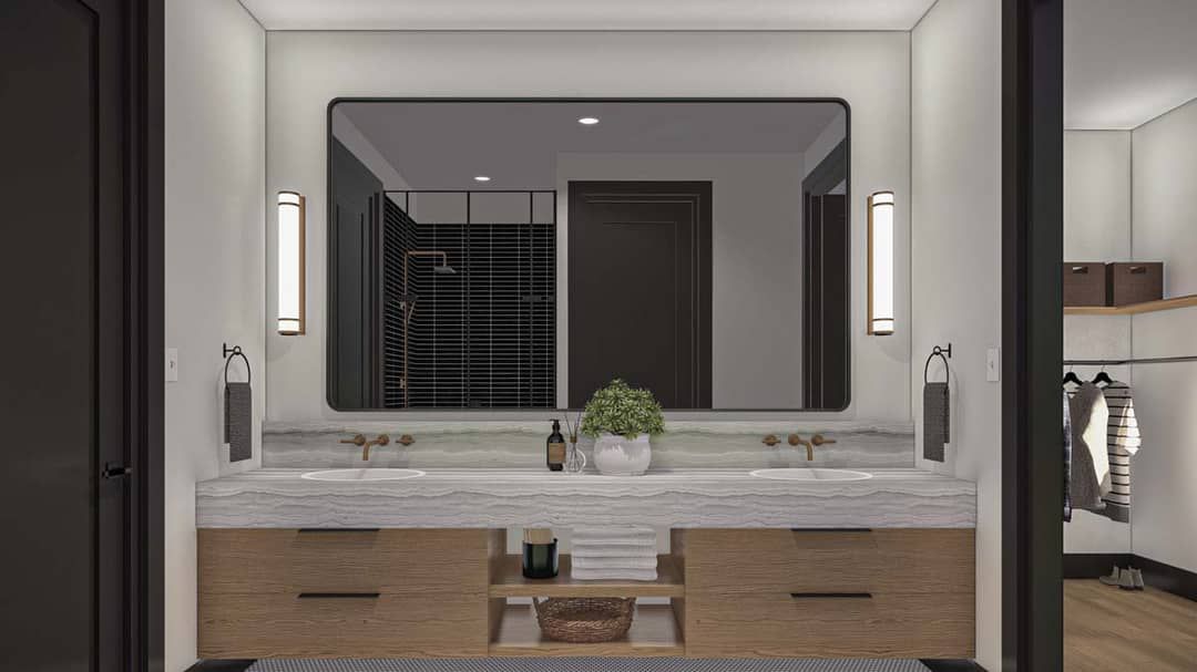 The kitchen is likely to include a large island, efficient work triangle, and generous cabinetry. A walk-in pantry or butler’s pantry may be incorporated to support functionality in the barndominium context.