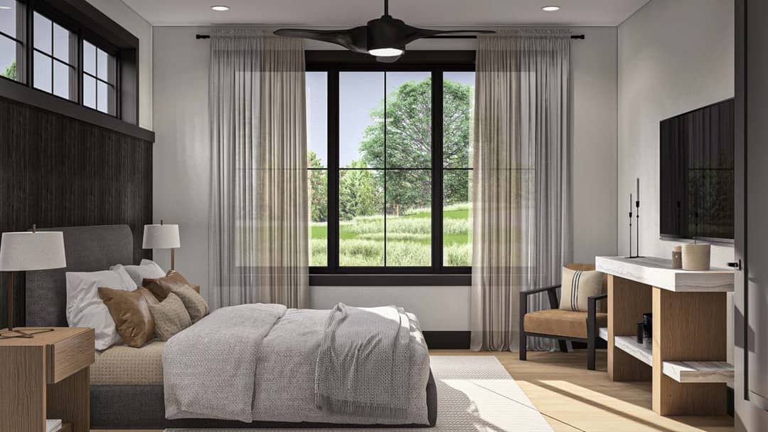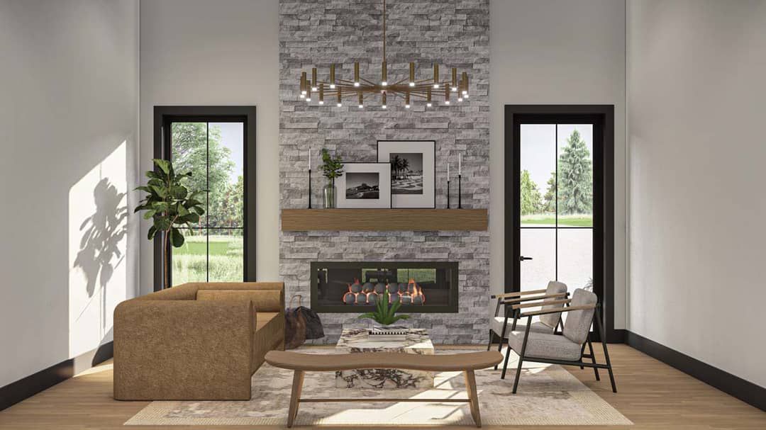 The great room is the focal point—with sloped ceilings, generous windows, and a strong visual connection to the porch zones. It’s a dramatic space that anchors the home.