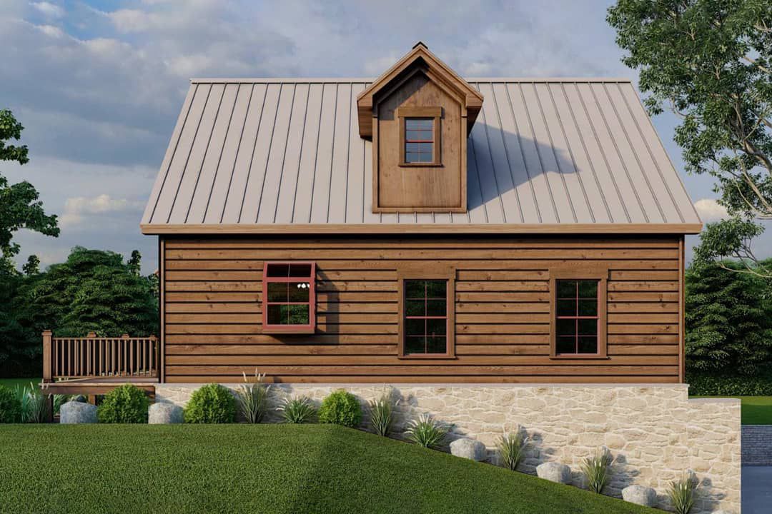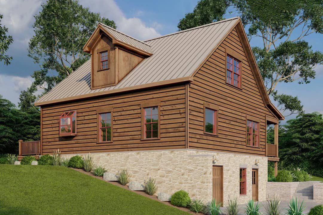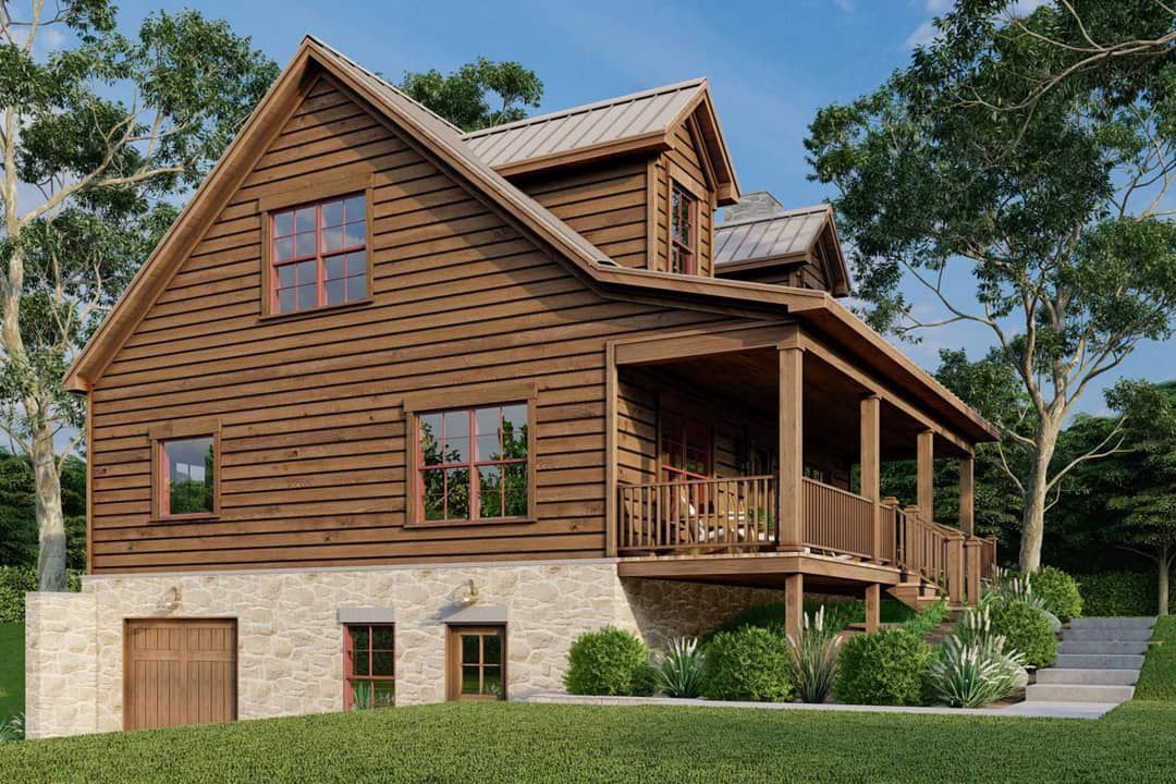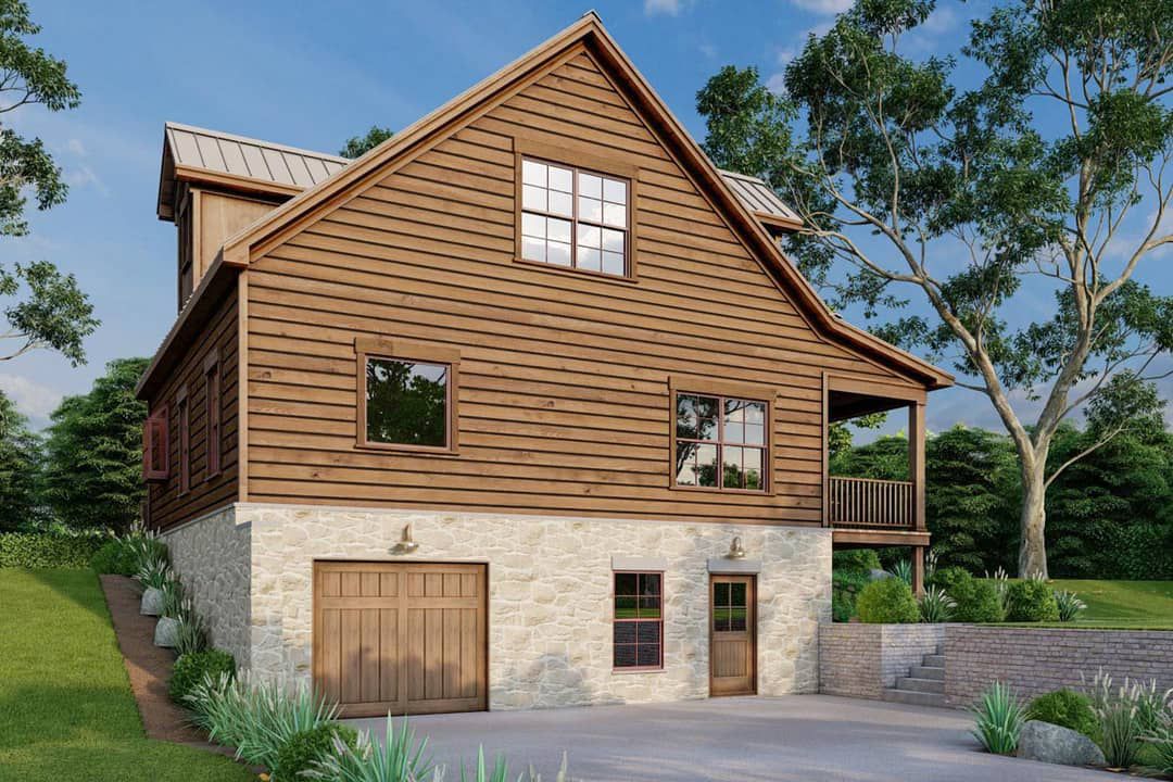 The garage below is a drive-under style, with side entry for the vehicle, giving sheltered parking while preserving the cabin aesthetic above. 3