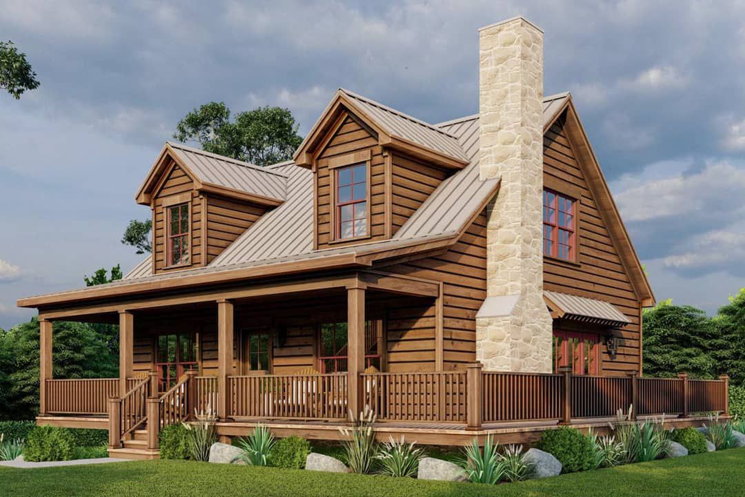 The cabin’s exterior carries strong rustic character: full-width 8-ft deep front porch, side deck, timber accents, dormers, and broad rooflines that anchor the home into a wooded or sloping landscape. 1