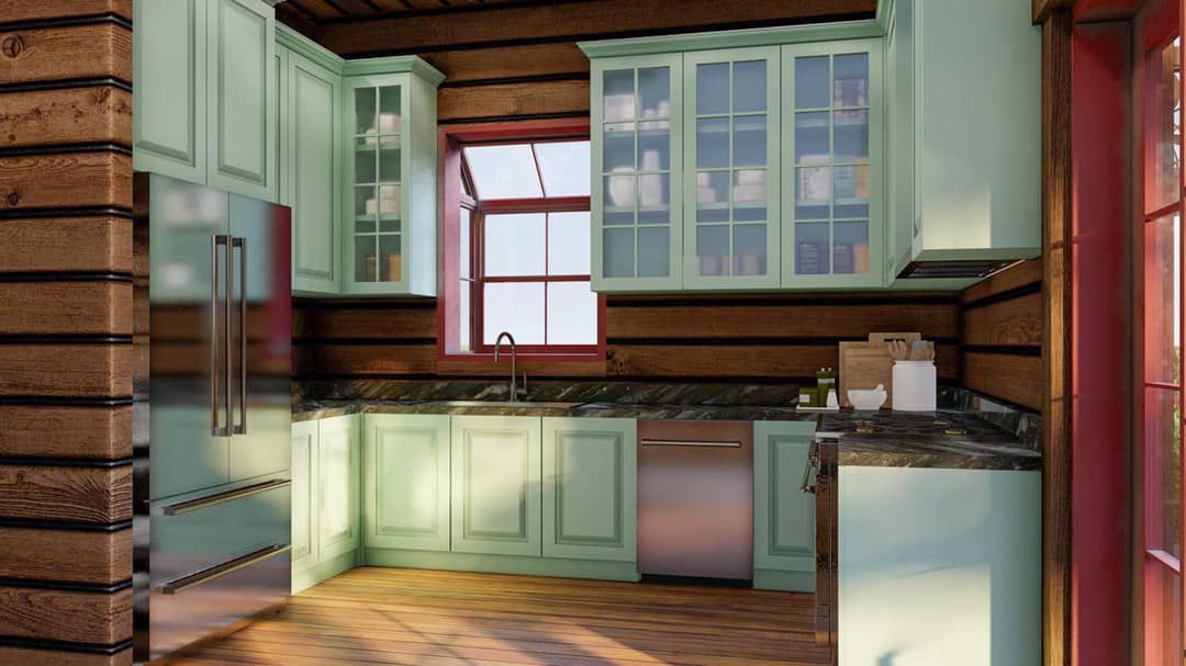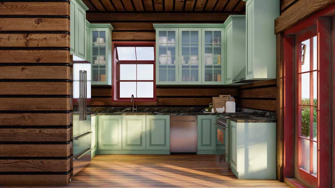 A walk-in pantry or built-in storage may be included to support the rustic cabin’s storage needs.