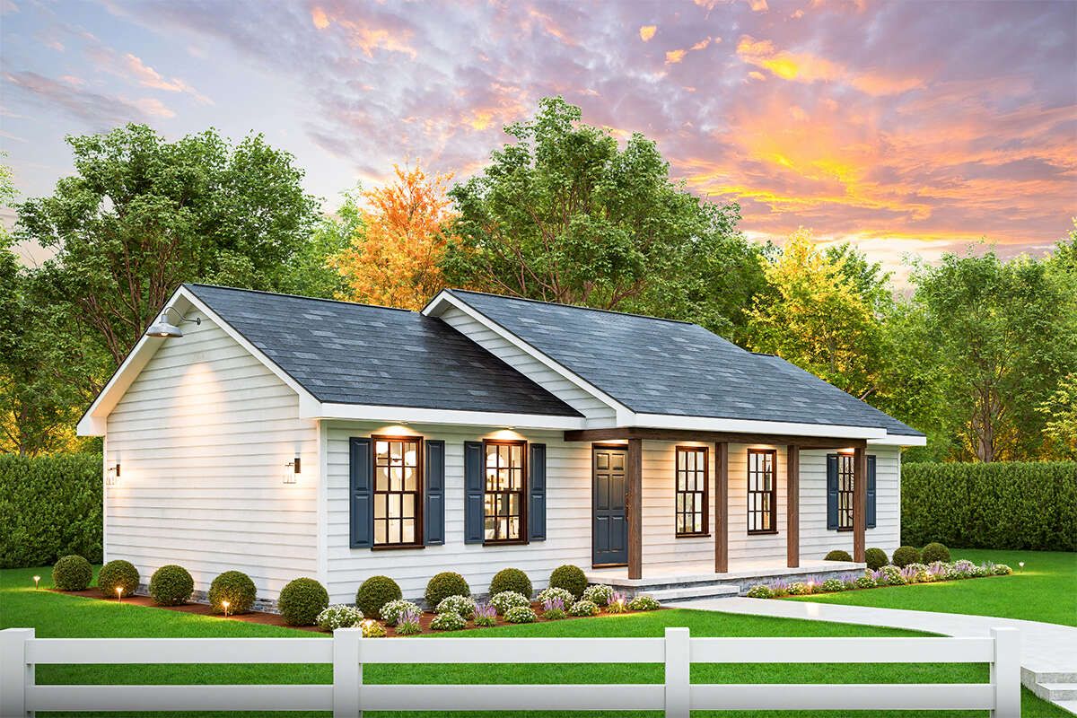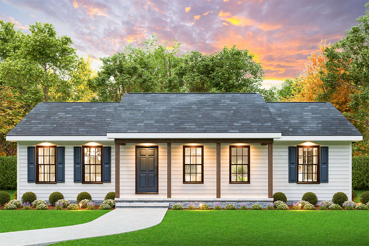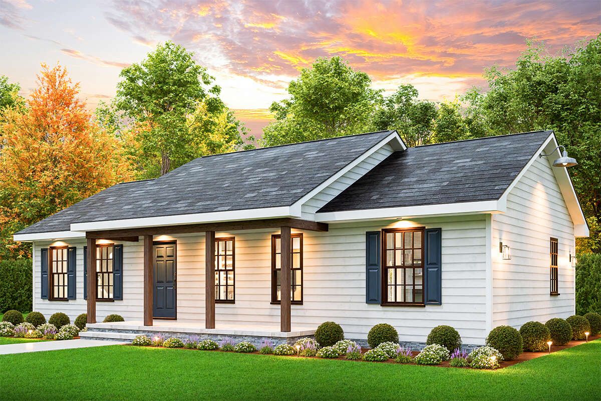 The exterior design leans into classic country aesthetics: a modest gabled roof with a 6:12 pitch, simple lines, and practical proportions. The front porch (110 sq ft) provides a sheltered entry and charming curb appeal. 1