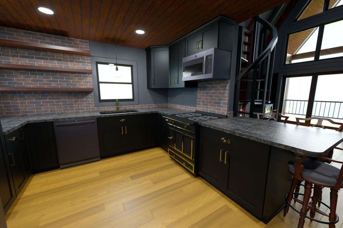 The kitchen is located at the rear, featuring an angled peninsula with seating for up to six, and easy access to the dining area. 8 Sliding barn doors connect the great room to the master suite. 9 Upstairs (701 sq ft) are bedrooms 2 & 3, a full bath, and a linen closet. 10