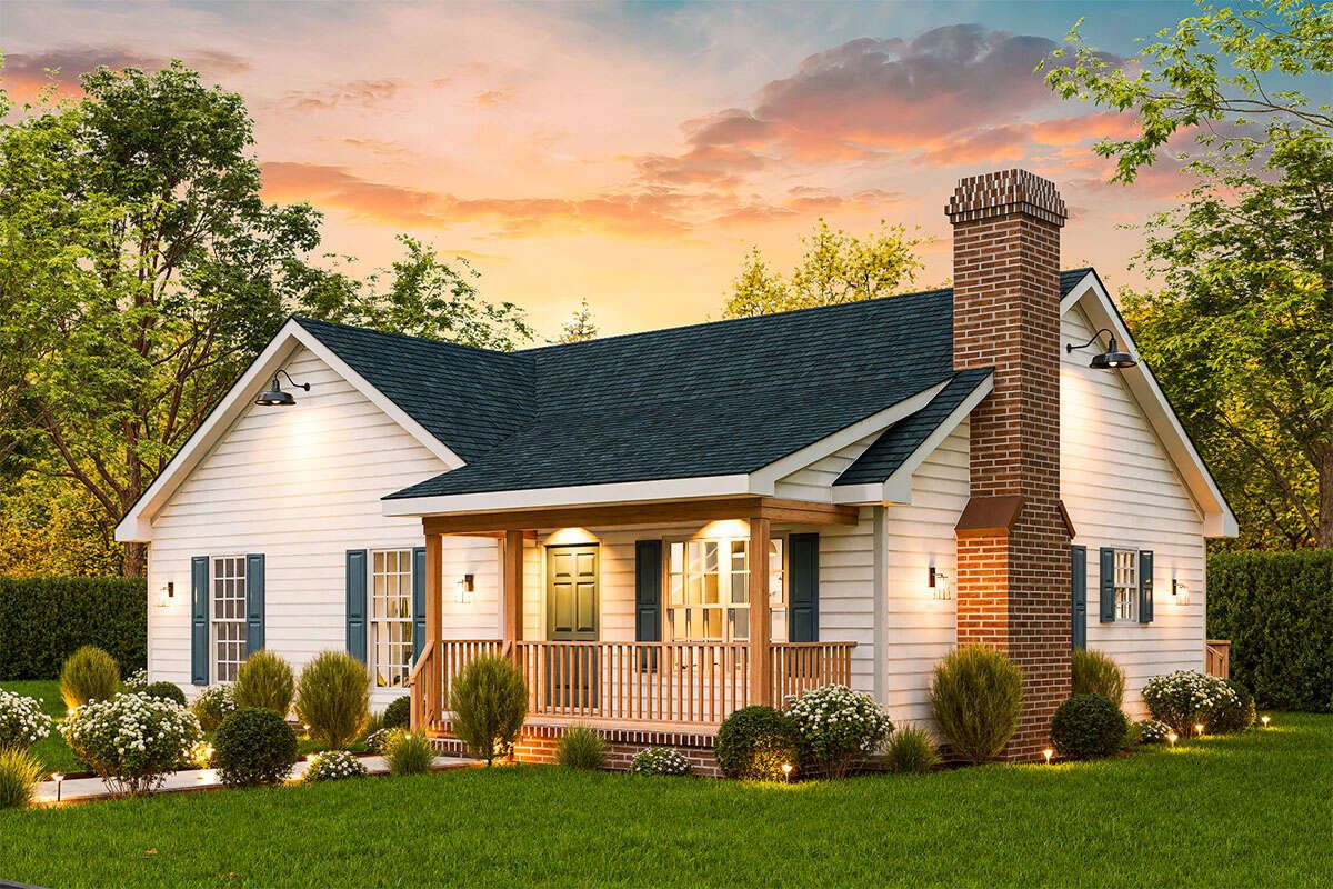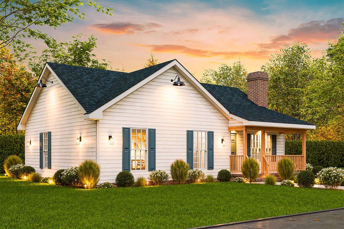 With just over 1,200 sq ft, this plan manages to deliver three bedrooms, two full baths, and a logical layout without wasted space. The split bedroom design offers privacy, and the central living core supports family interaction. Its modest scale, simple construction, and balanced design make it ideal for a small family, downsized home, or rural site where charm and efficiency both matter.