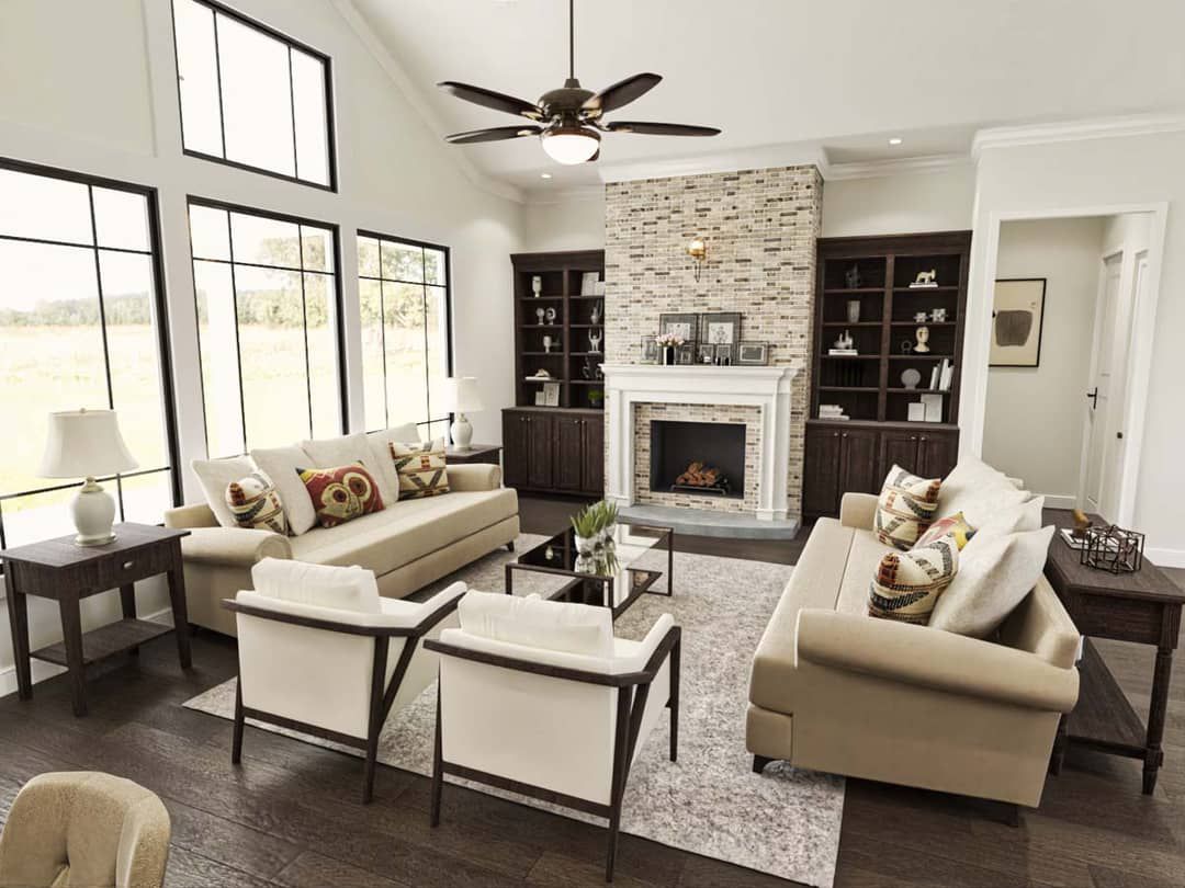 This plan uses height and layout to amplify sense of space. The split-bedroom arrangement offers both intimacy and shared life. With vaulted ceilings at its core and porch designs that echo that elevation, it feels open, gracious, and comfortable all at once. For those wanting a balance of character, function, and a bold interior presence in a single story, this design is an excellent option.