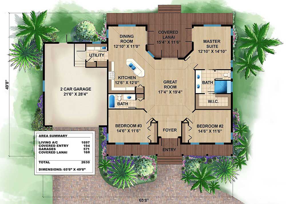 This attractive plan offers **1,697 heated sq ft**, with **3 bedrooms**, **2 full baths**, and a **2-car front-entry garage** (571 sq ft). Generous front and rear porches (194 sq ft front, 168 sq ft rear) frame both sides of the home. 0