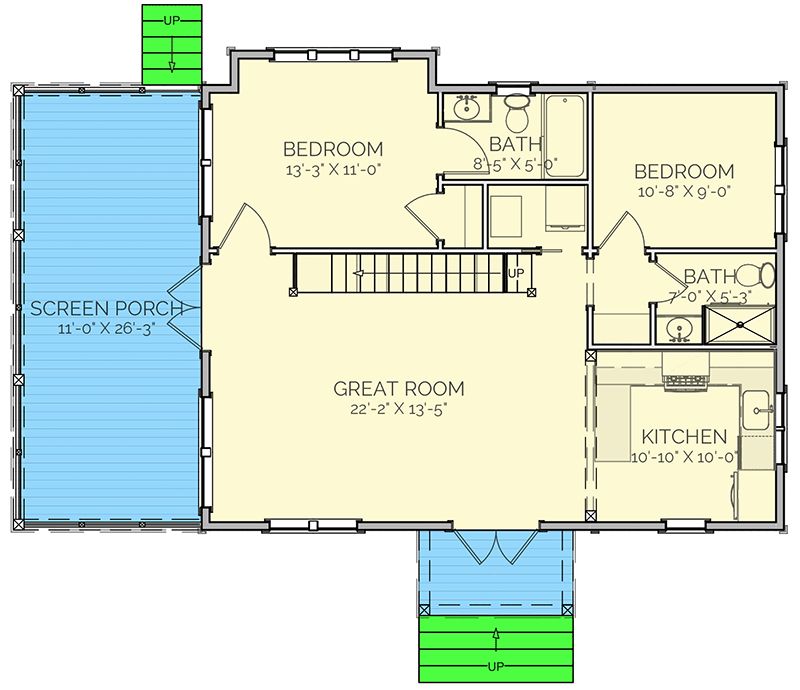 The vaulted great room helps the home feel larger than its square footage while retaining single-floor convenience for primary living zones. Compact sleeping and service areas reinforce efficiency. The screened porch encourages outdoor living, reducing the need for oversized indoor square footage.