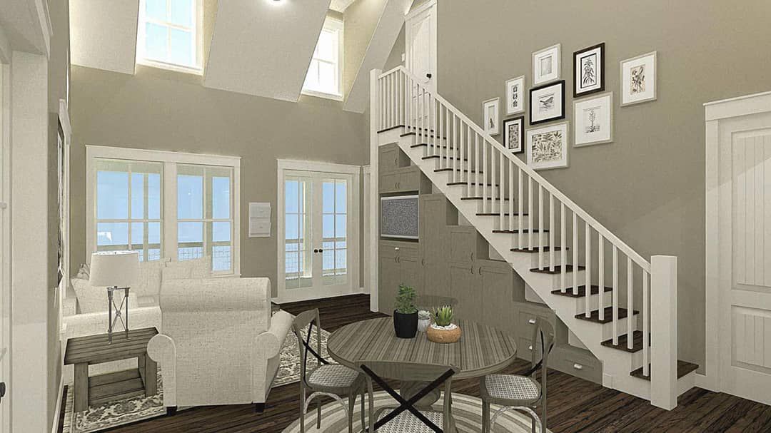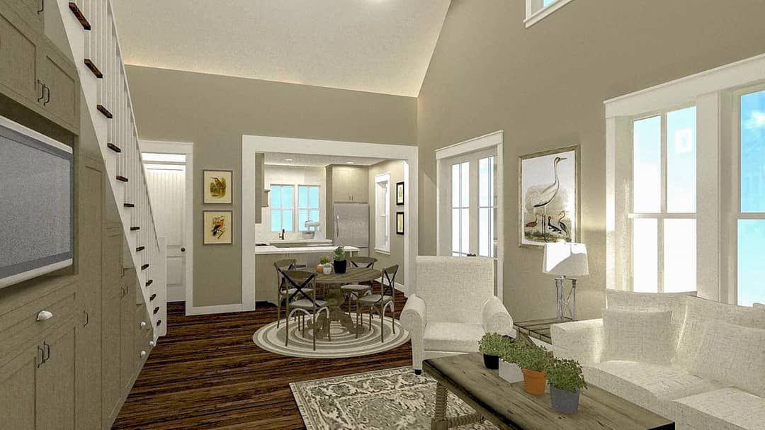 Entering through French doors under the shed roof porch, you step directly into the great room which flows seamlessly into the kitchen. The open living-kitchen-dining zone occupies roughly 908 sq ft on the main level—efficient yet generous for its size. 4
