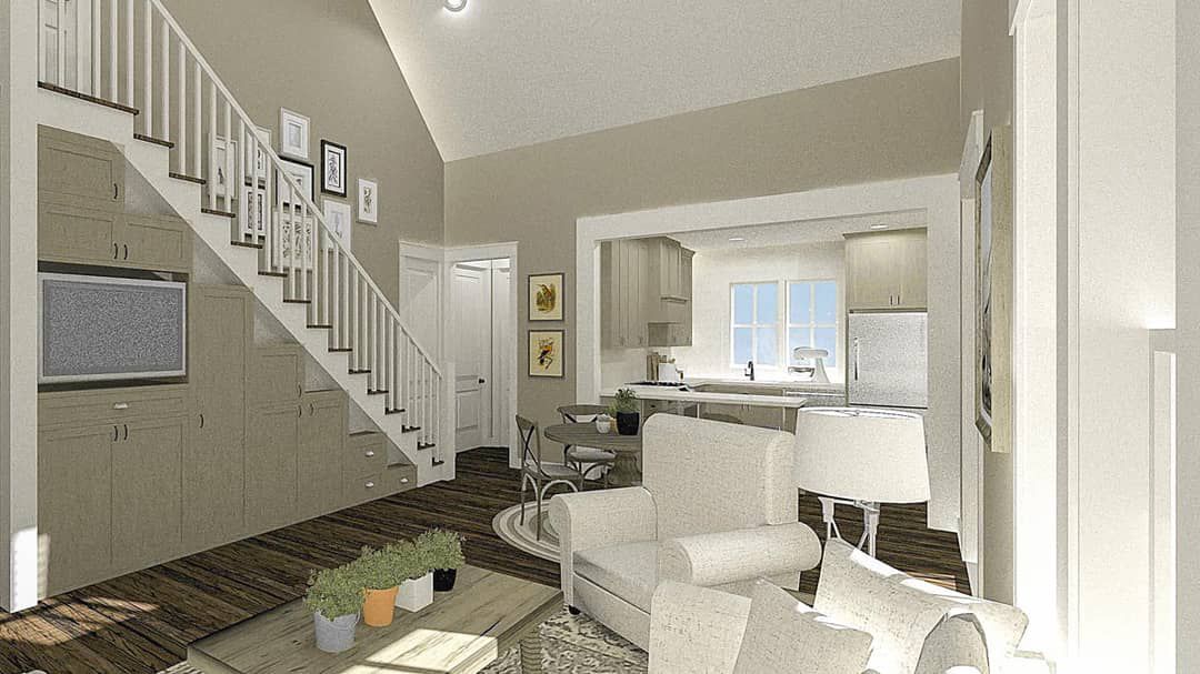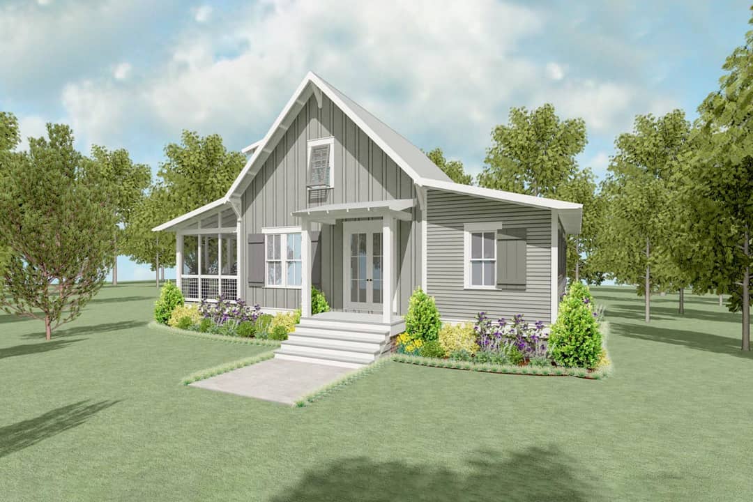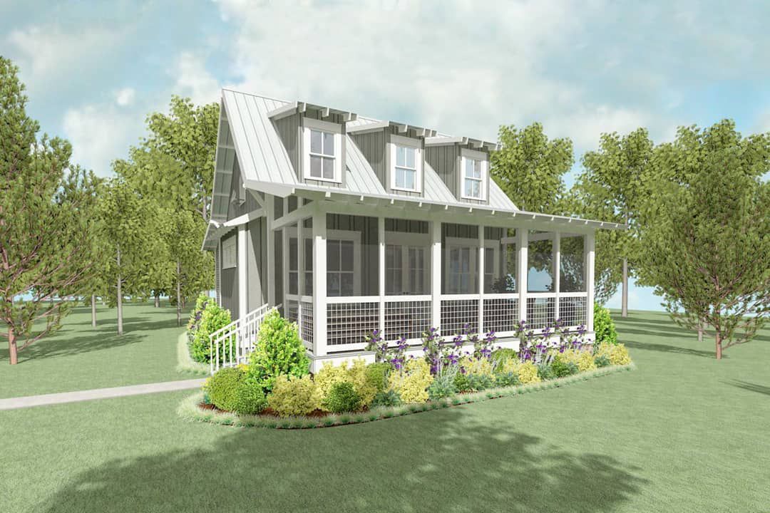 This plan hits a sweet spot: charming farmhouse styling, loft-added flexibility, screened-porch outdoor living and a compact build footprint. It works for couples, small families or vacation-home buyers who want something more than a strict tiny house but still efficient and manageable.