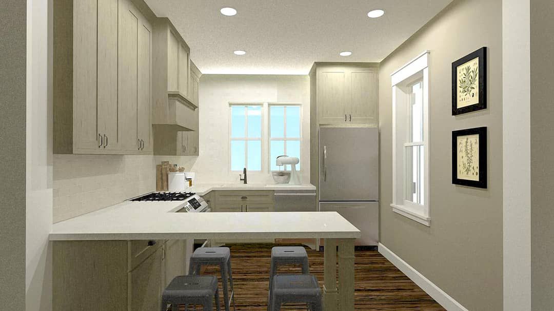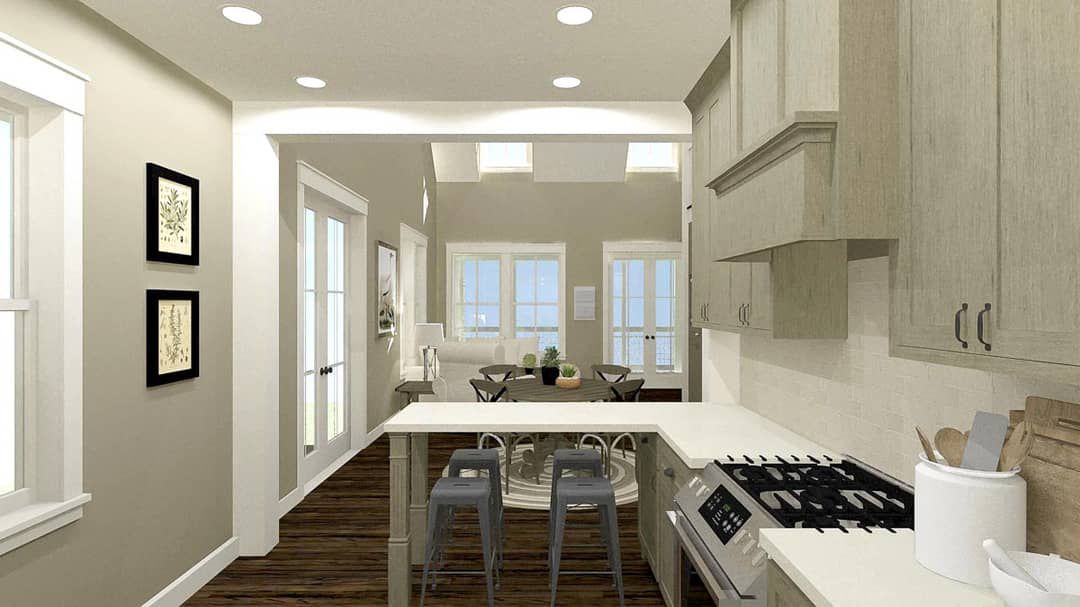 The kitchen is integrated into the central living corridor with a peninsula offering casual seating. This design maintains openness while delineating the kitchen zone without bulky walls. 7