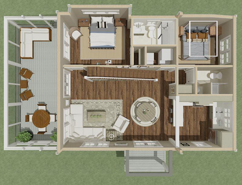The vaulted great room helps the home feel larger than its square footage while retaining single-floor convenience for primary living zones. Compact sleeping and service areas reinforce efficiency. The screened porch encourages outdoor living, reducing the need for oversized indoor square footage.