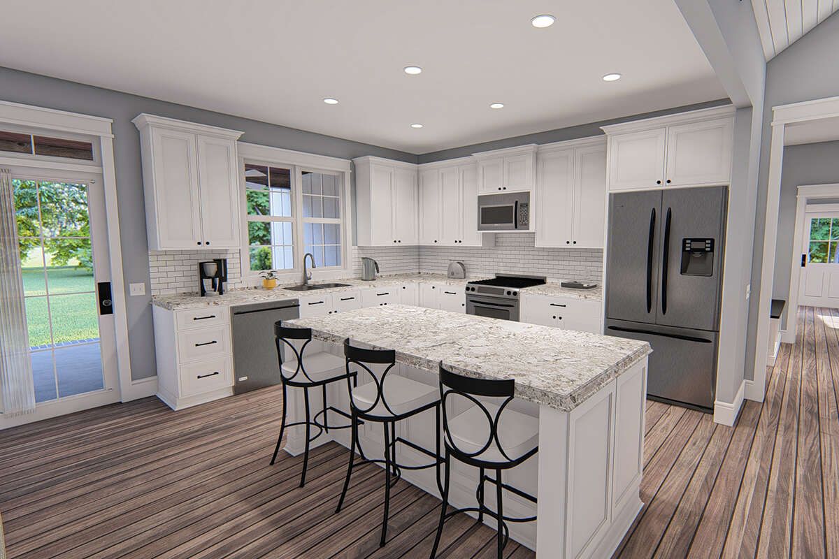 The open-plan kitchen anchors one end of the living space, enabling cooking and conversation to happen simultaneously. Because the master suite is tucked away, entertaining in the public zones doesn’t intrude on private life—smartly designed for real-life usability.
