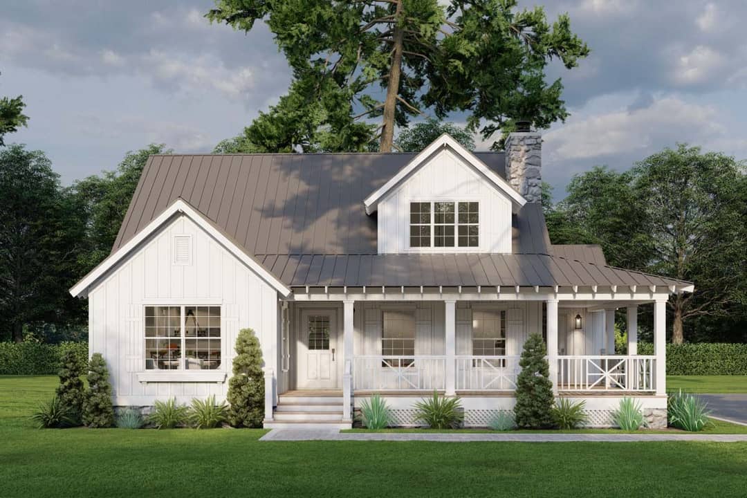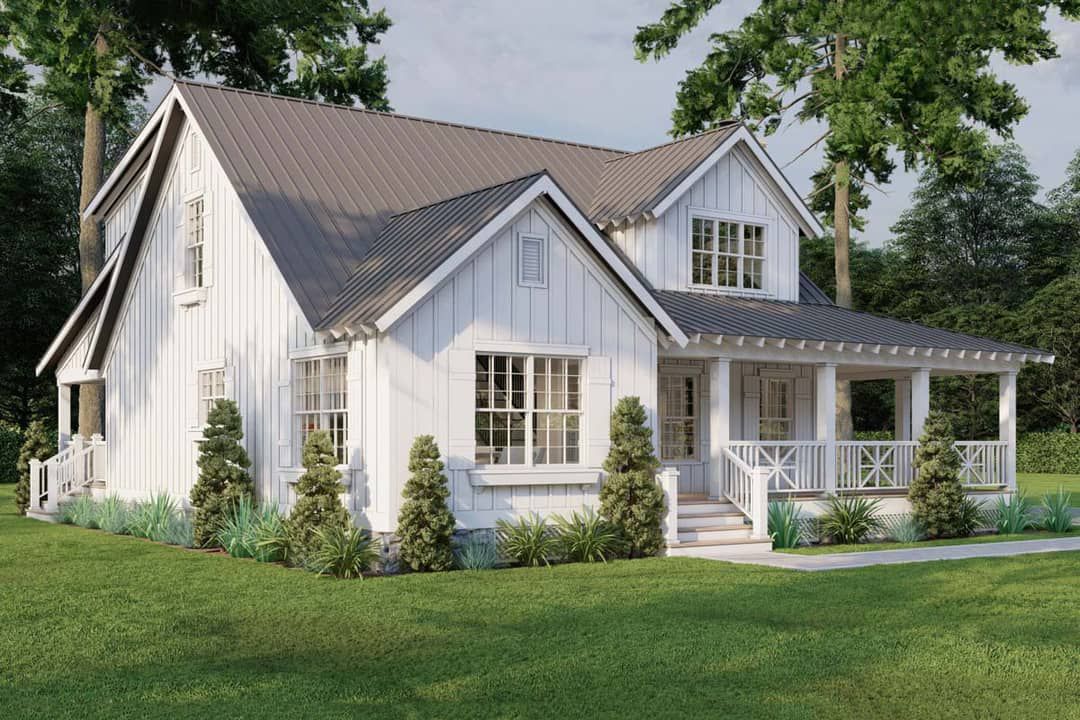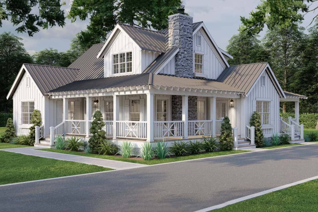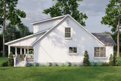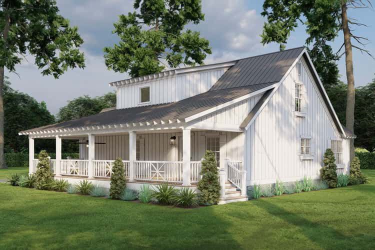 The home spans roughly **44′-2″ wide by 51′ deep** with a maximum ridge height of **22′-4″** giving a well-proportioned footprint. 1 A welcoming L-shaped front porch (8-ft deep) wraps part of the façade, while a generous rear porch (12-ft deep) extends the outdoor living area—together offering about **894 sq ft** of covered exterior space. 2