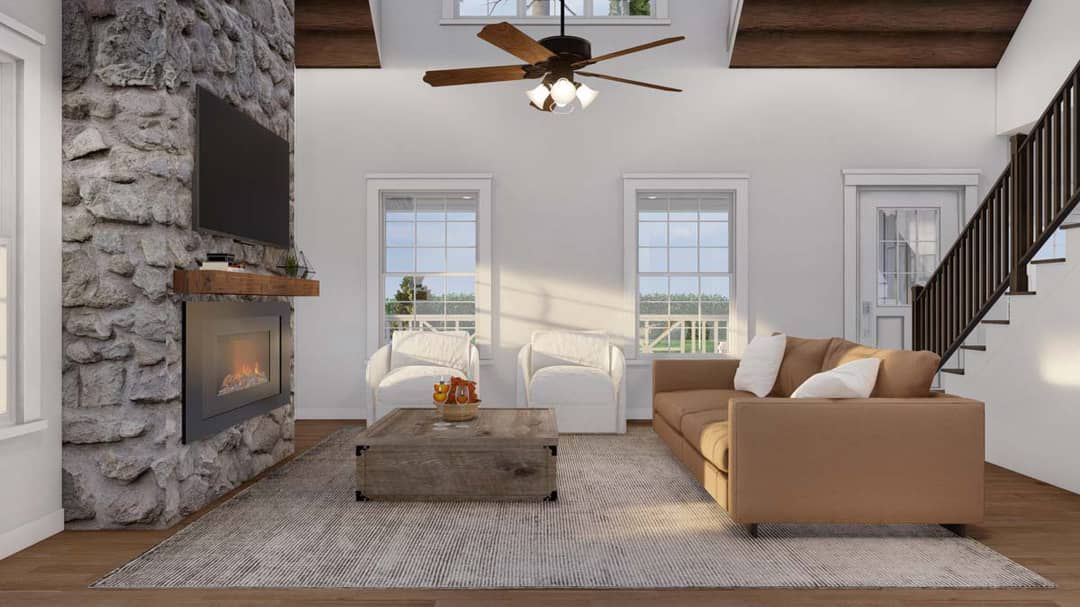 Framed with traditional 2×4 exterior walls (with optional 2×6 upgrade), and roofed at a primary pitch of 10:12 with secondary 4:12 transitions, the structure embraces rustic aesthetics while staying streamlined. 3 Natural stone or reclaimed rock accents around the great-room fireplace anchor the aesthetic; generous windows and gables allow light to flood the interior while blending seamlessly with country surroundings.