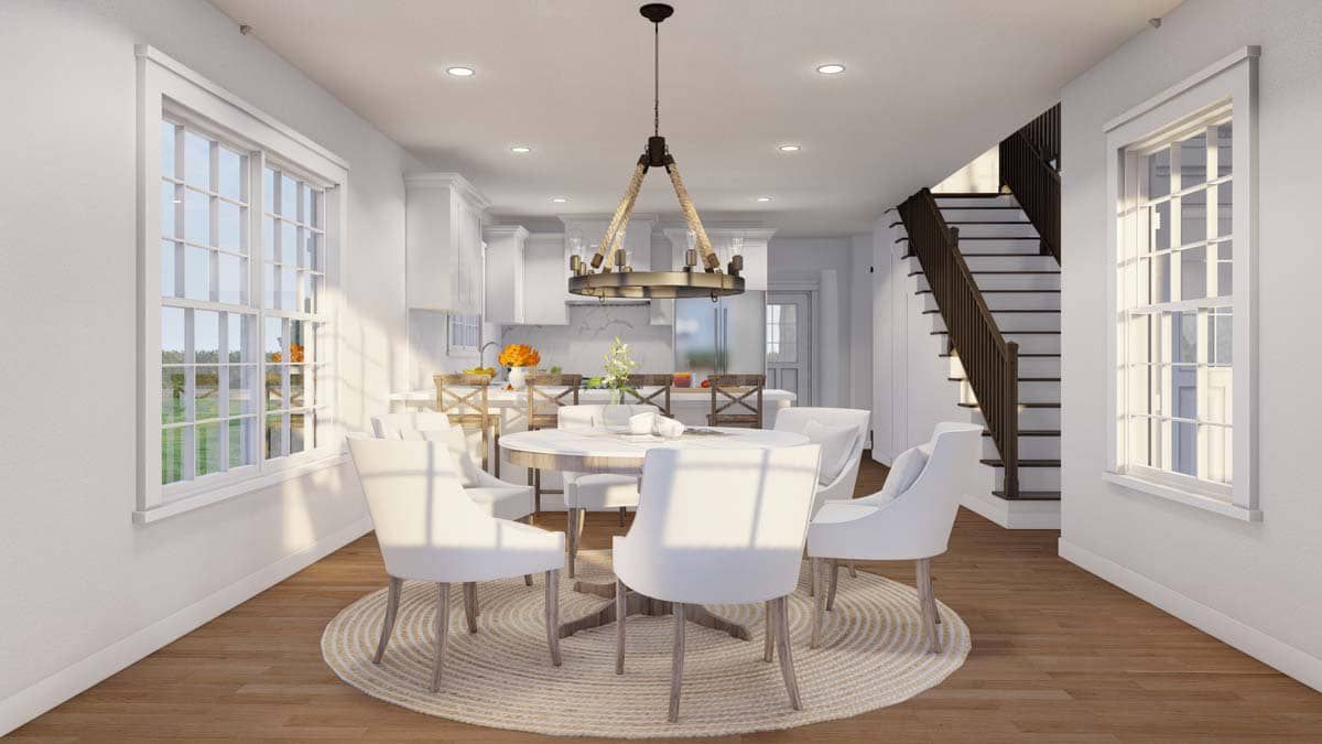 The dining area sits adjacent to both the kitchen and rear porch access, facilitating indoor-outdoor meals and entertaining. The interplay of open space and clearly defined zones allows comfortable everyday living and effortless hosting.