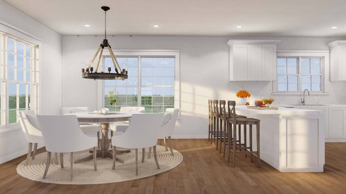 The heart of the home is the open living/dining/kitchen zone beneath the soaring great‐room volume. With the loft above, a sense of expansiveness is achieved without inflating the footprint. Large windows and the rear porch doors fill the area with natural light.