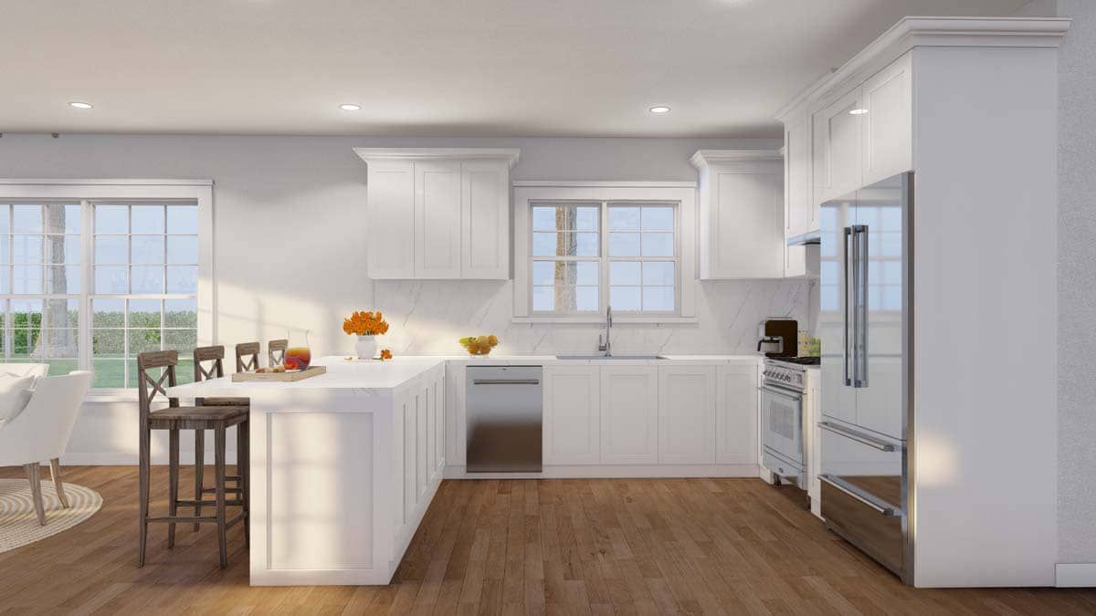 The kitchen showcases a peninsula providing seating for four, an adjacent pantry cabinet and walk-in pantry—features that elevate utility in a compact footprint. 7 The layout places the work triangle close to the dining area and supports interaction with guests in the great room. High-quality finishes such as stone counters, shaker-style cabinetry and timber beams highlight the rustic motif while delivering modern function.